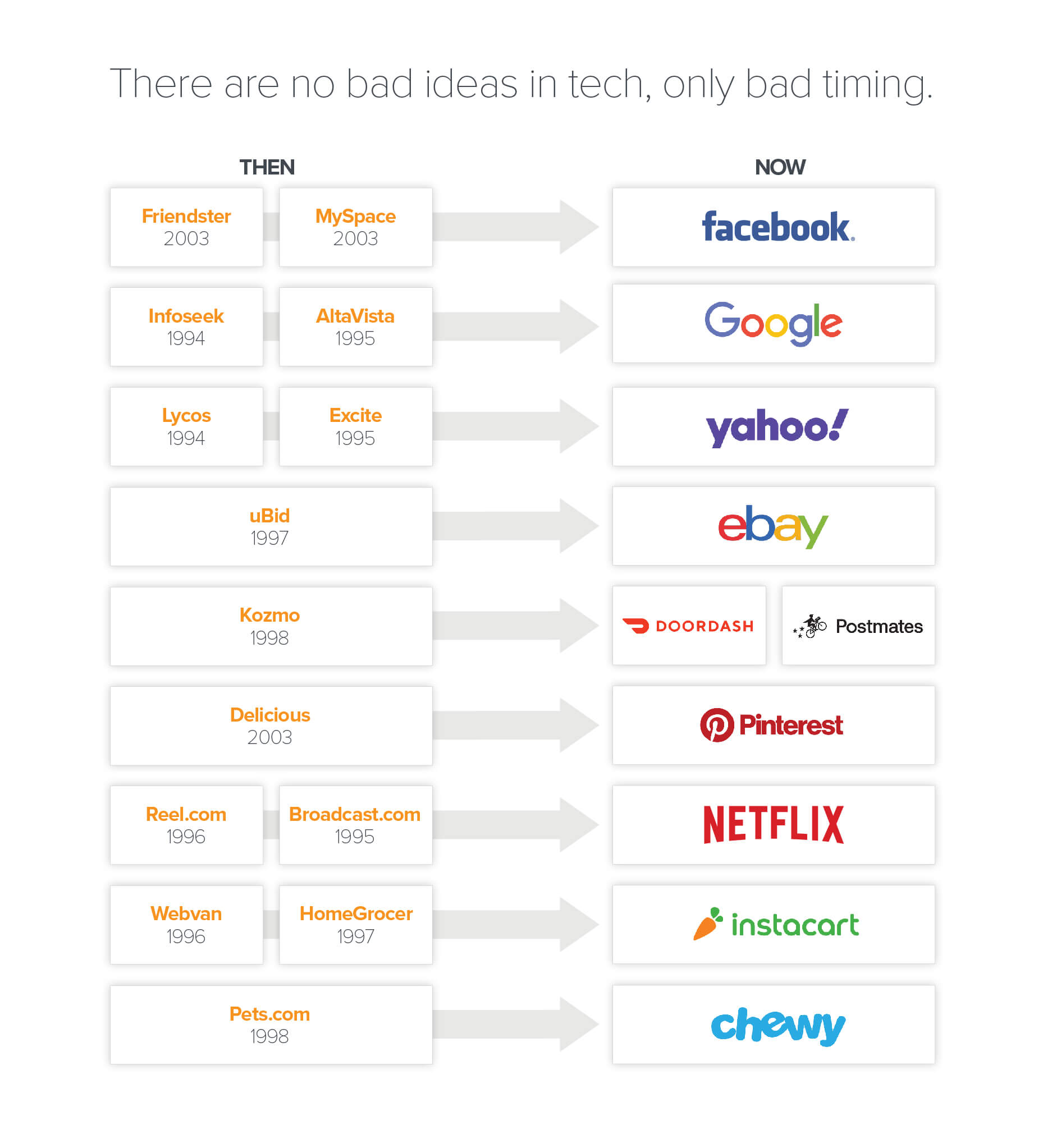It’s a common story. Here are some other examples of the right idea coming at the wrong time, along with subsequent proof points on the quality of the ideas: