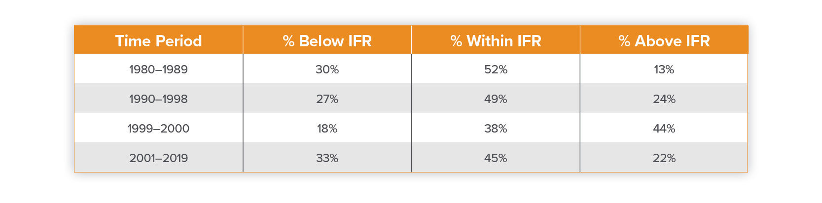 - If we look at the percentage of IPOs that priced above the initial filing range (the far right column in the table), the 1980-89 time period has the lowest percentage. That is, about 87% of the IPOs in that cohort priced within or below the initial filing range, but only 13% priced above.