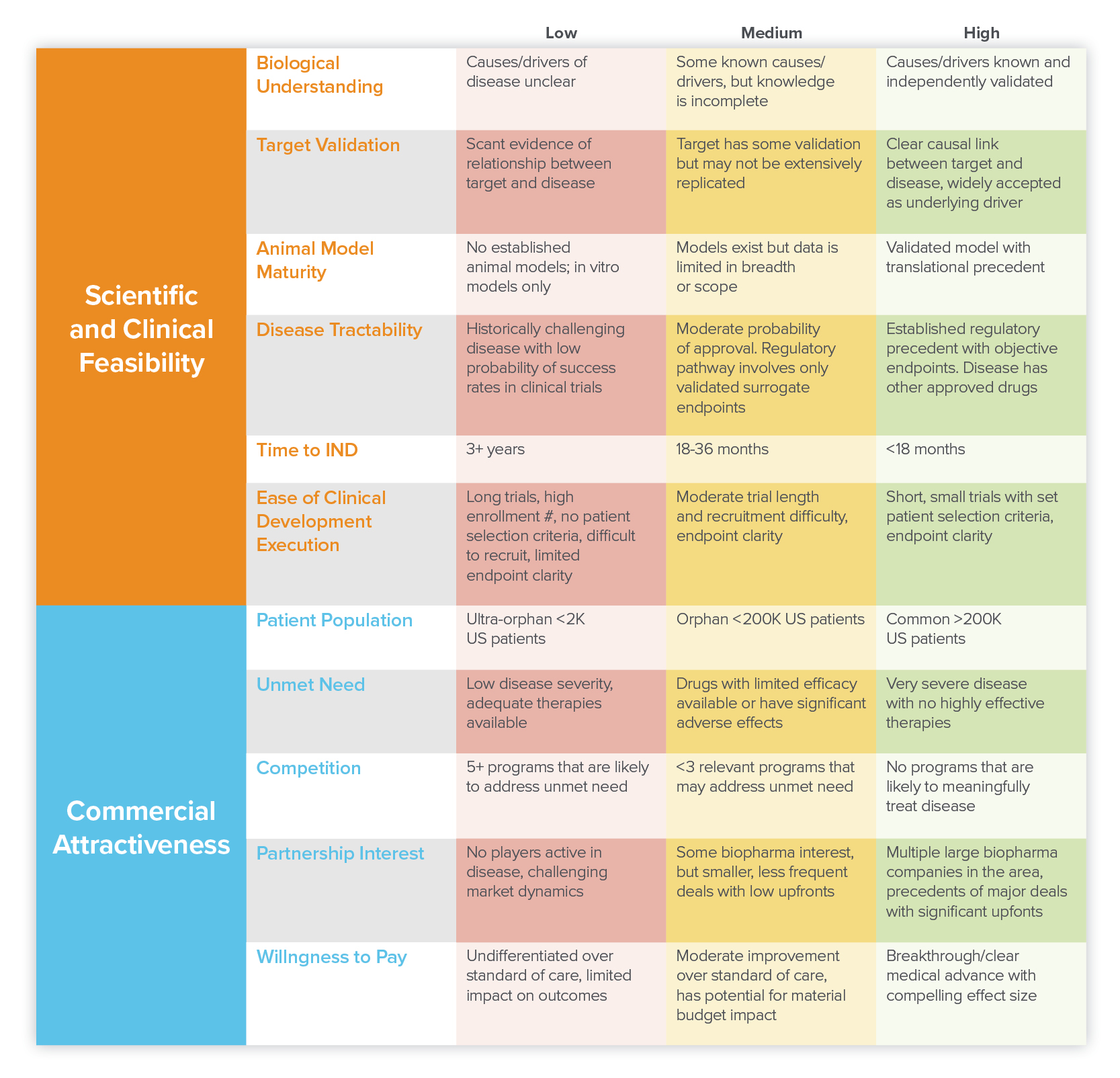 For those who have identified their superpower and have begun to narrow down a list of diseases that play to their strengths, the next steps are even less formulaic and there is likely a spectrum of answers on a sliding scale depending on your goal. It is important to think through two core axes: scientific/clinical feasibility and commercial attractiveness. Within each of these axes there are several key factors to consider and for each, we can assign a low, mid, or high scoring that maps to how best to think about prioritization for a particular factor (the higher the better).