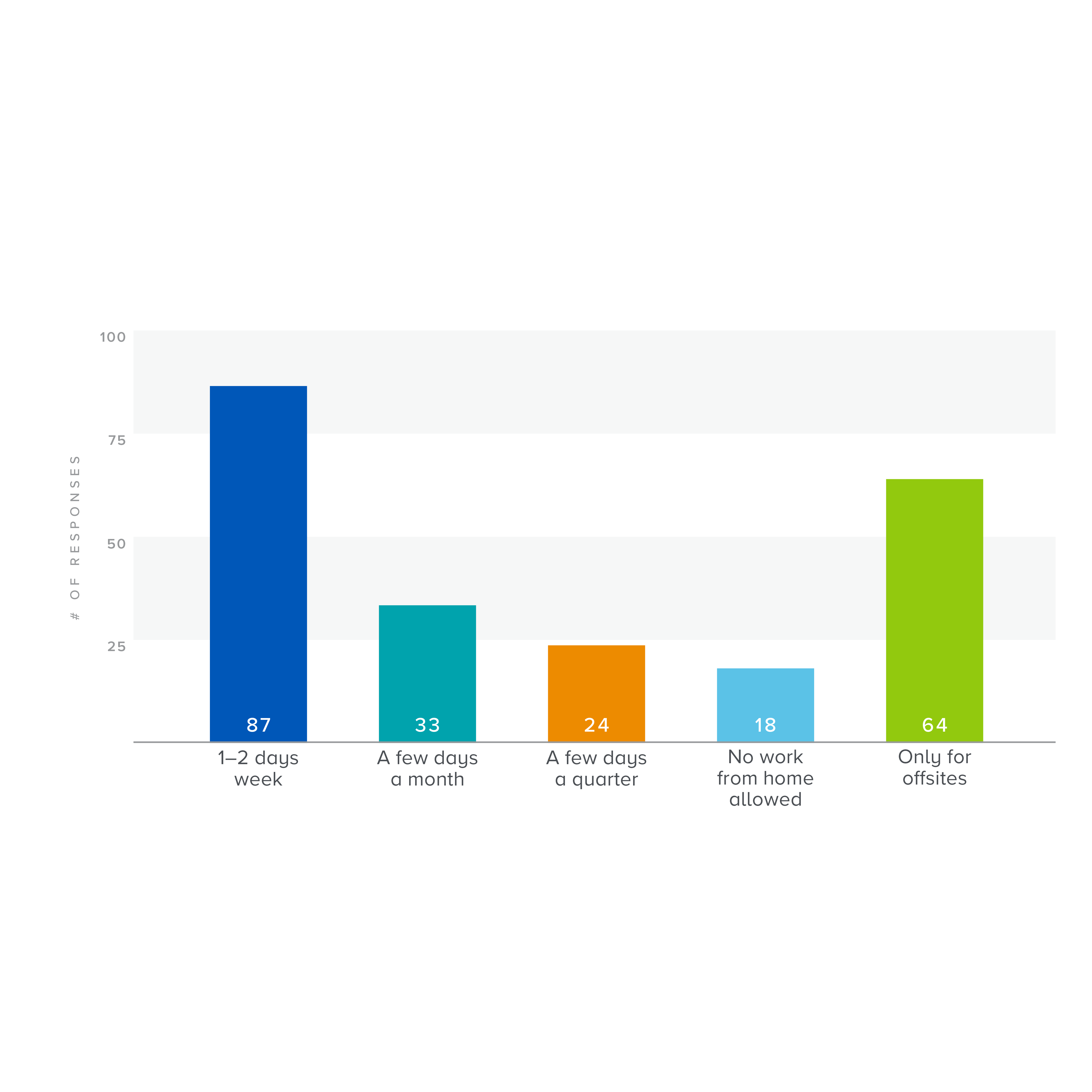 In our survey, about ⅔ of organizations said they would work in a “hybrid model,” with the majority of those opting to be in the office 1-2 days per week (38.8%) or in person only for offsites (28.6%).