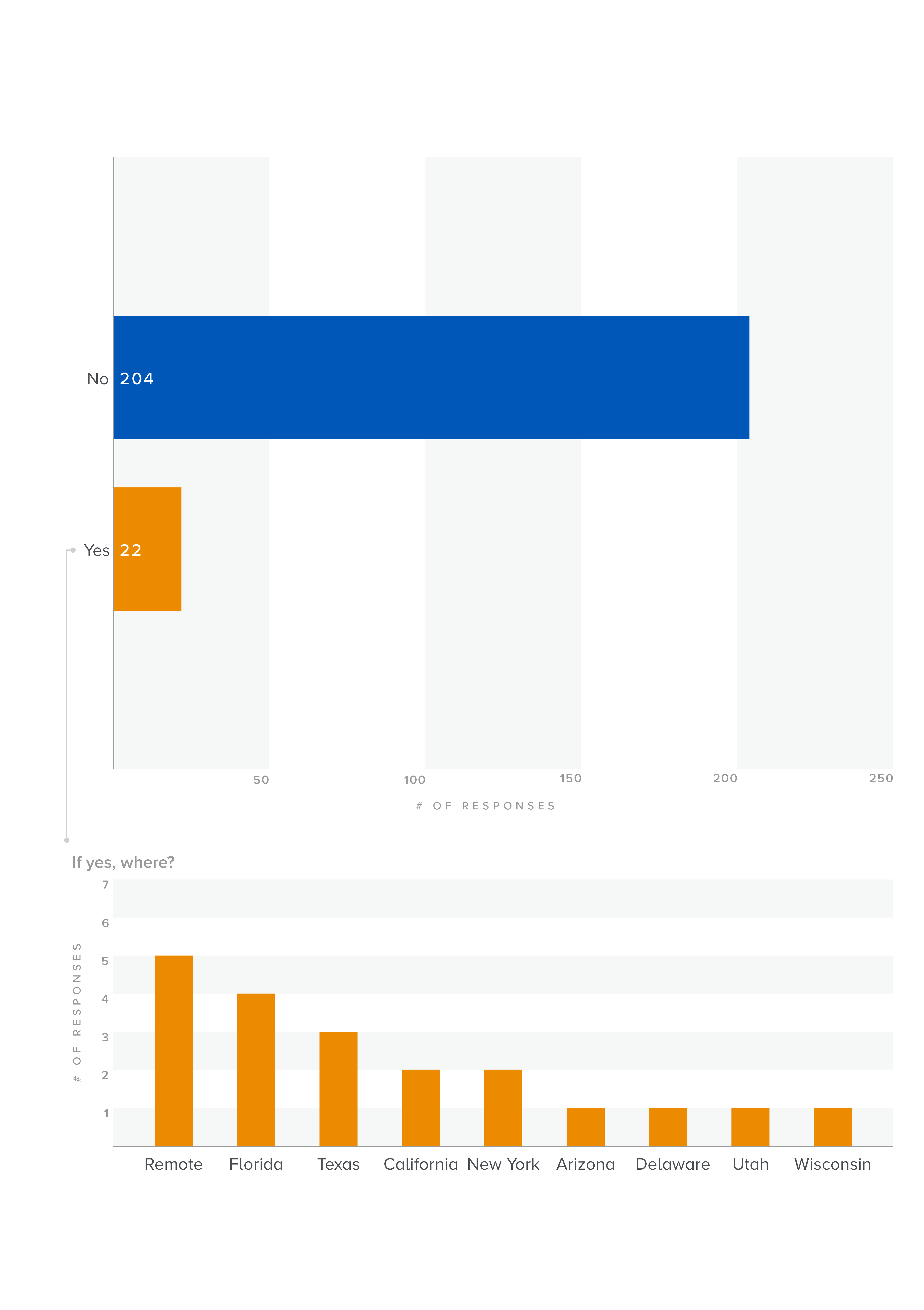 In short, the competition for the best talent, especially the best technical talent, is fierce, and many workplaces who prefer in-person work are making exceptions to match the desired location and lifestyle of certain employees, most often the top technical talent (e.g. an L7 engineer). In our survey, we found almost 90% of organizations will continue or plan to hire remote employees.