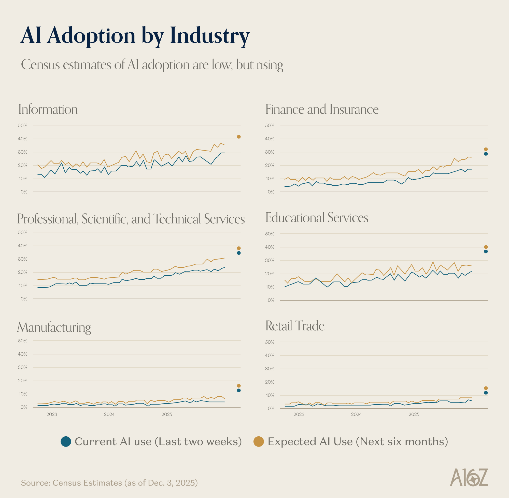 Contrast that with private AI companies: they can spend freely to capture market share, while public companies must find efficiencies first, battle internal resistance, navigate regulatory constraints, and deliver returns every quarter. This helps explain why, despite enormous potential, enterprise AI adoption remains “at the very beginning,” as Ben notes.
