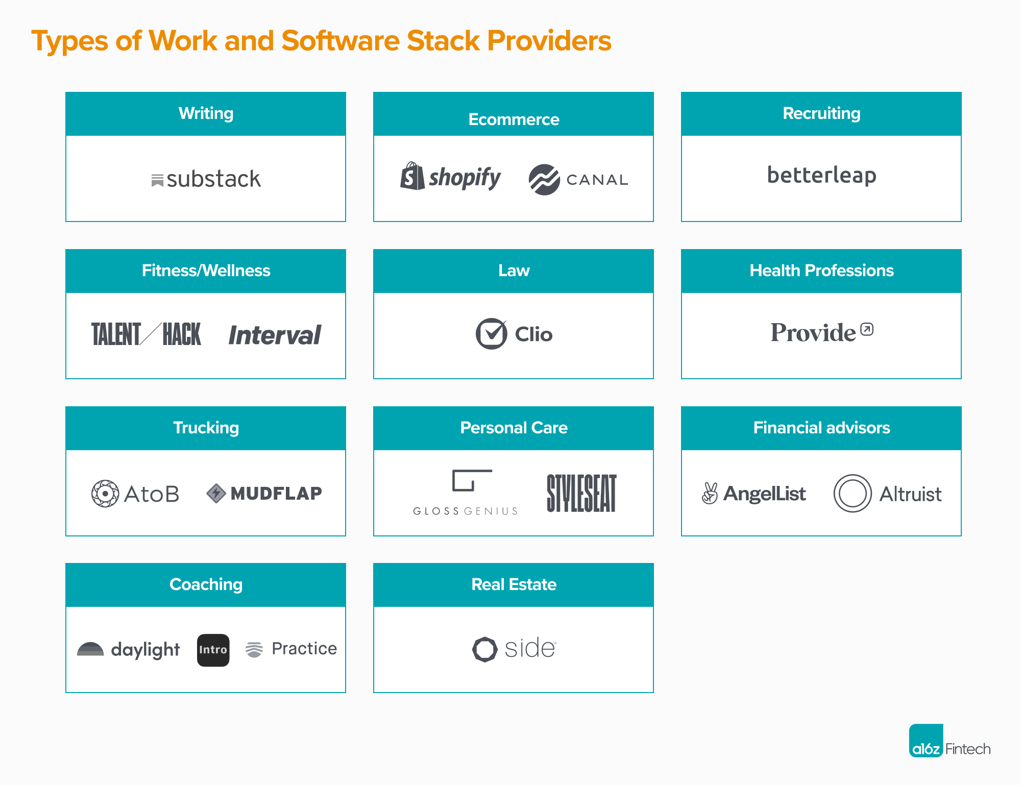 One example of the solo stack is Shopify. This company provides ecommerce sellers with tools (websites, payments, etc.) and networks (drop shippers, suppliers, etc.) so that they can focus on producing, curating, or procuring the goods they sell. The seller needs the set of tools that the firm previously provided, but tailored to the individual level. This loosely breaks down into: a set of SaaS tools to manage the business (including the fintech tools to take payments and grow the business); marketing and lead-generation tools to move the business forward; and a set of networks to help these new solopreneurs be successful. Every category of work will have its own specific mix of these functions.