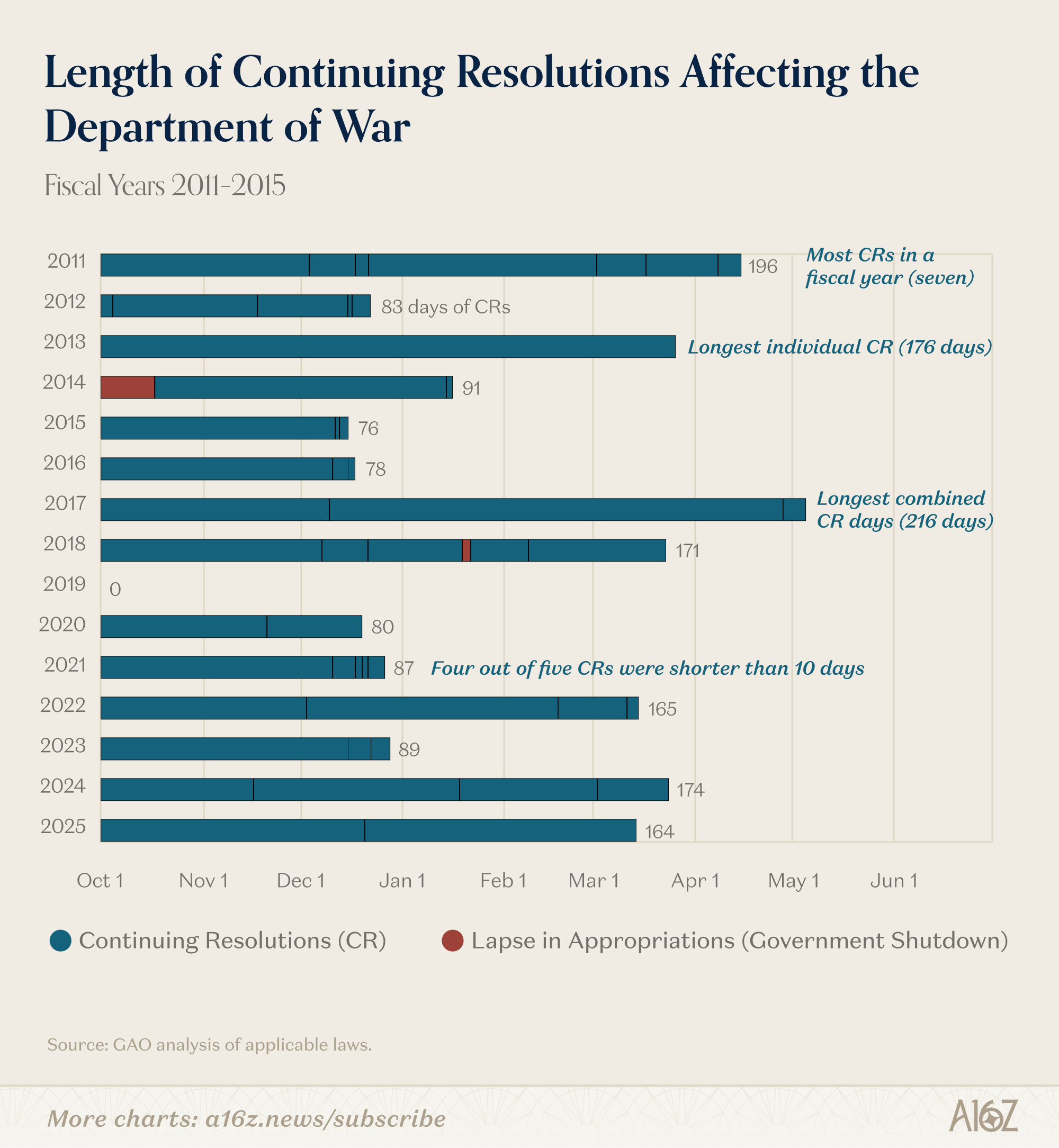 When Congress fails to pass a Defense Appropriation by the last day of the federal fiscal year — September 30th, for the following year, appropriations are said to have lapsed. This means either the federal government shuts down, or Congress passes a resolution to continue funding the executive branch incrementally, at levels equal to the previously passed appropriation. This law — called a Continuing Resolution (CR) — typically has substantial constraints on how the executive branch may use the funds, particularly when it comes to beginning new initiatives that have not been previously appropriated for. CRs are a persistent feature of the funding landscape and have occurred in every budget cycle over the last five years, typically lasting 2–3 months and in some cases as long as 6 months.