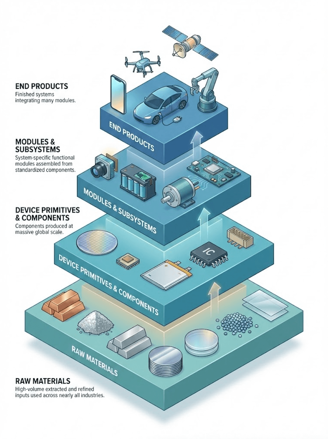 By modules, I mean the integrated subsystems that form the middle layer bridging low-cost components and high-value finished products. At the lowest level, ultra-commoditized materials like wafers, foils, and polymers are produced at massive scale and combined into standardized primitives: diodes, electrodes, windings, lenses, passives. The modular middle packages these primitives into functional building blocks, abstracting away unneeded complexity and allowing OEMs, original equipment manufacturers, to effectively tap into mature, high-volume supply chains that sit upstream.