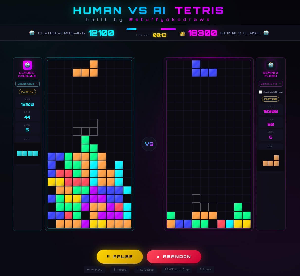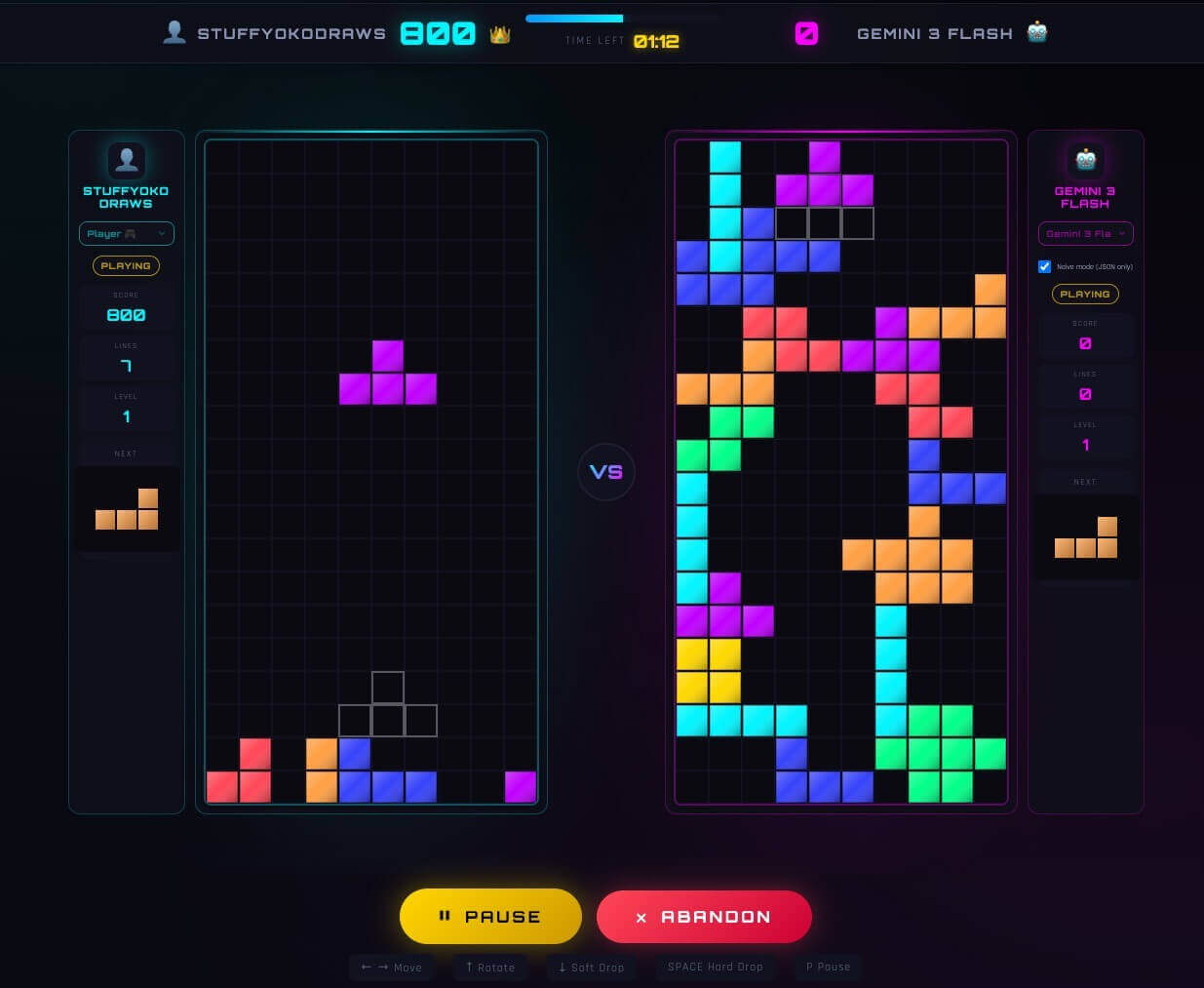 To make the experiment more interesting, I set up two simple arenas: one where a human and a model played side-by-side under the same rules, and another where models played each other repeatedly to surface behavioral differences at scale. In the project there’s a “headless mode” where I can have models compete on Tetris using the same engine in batch.