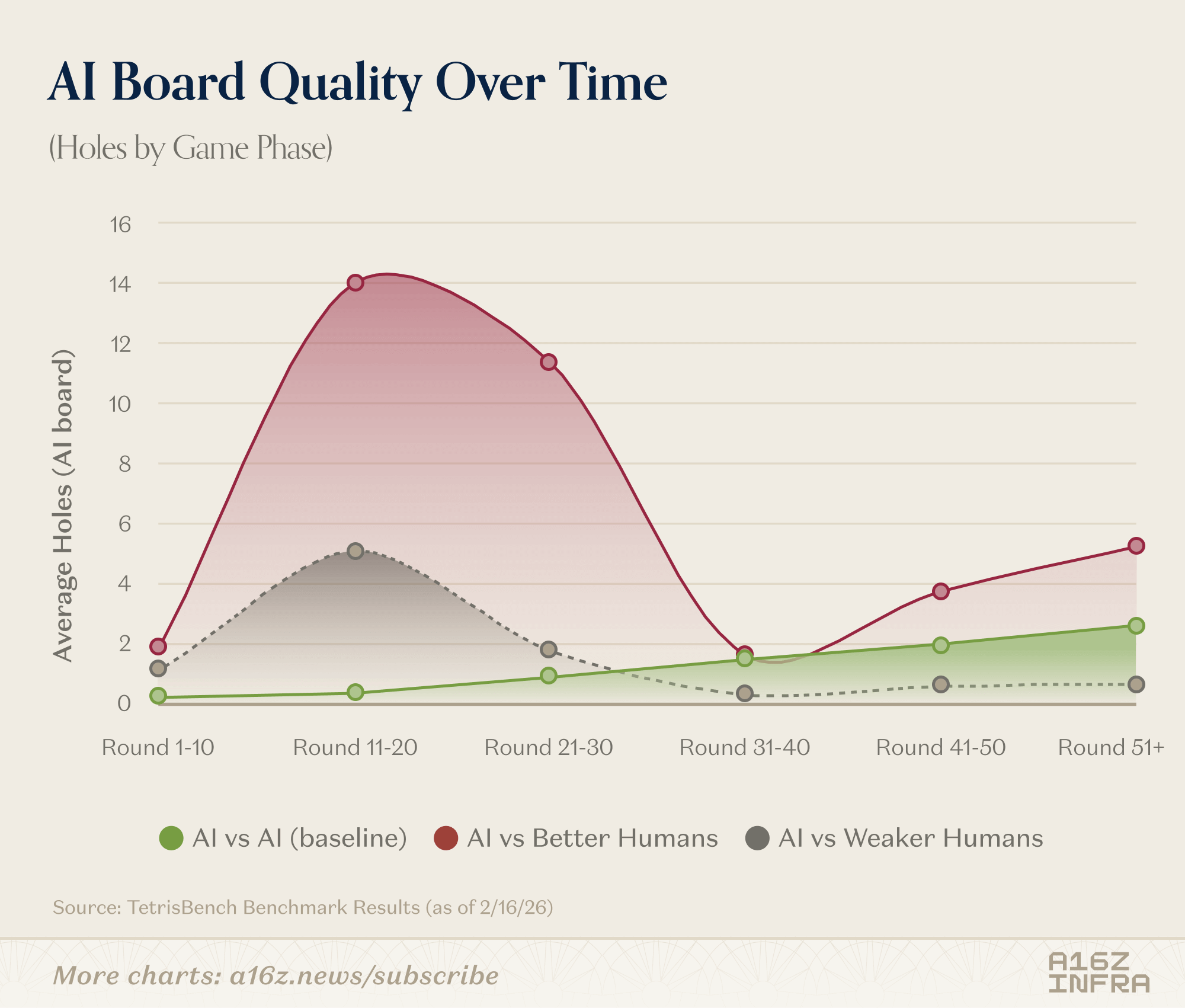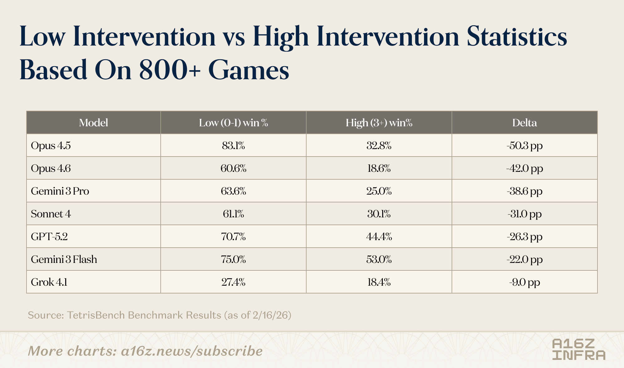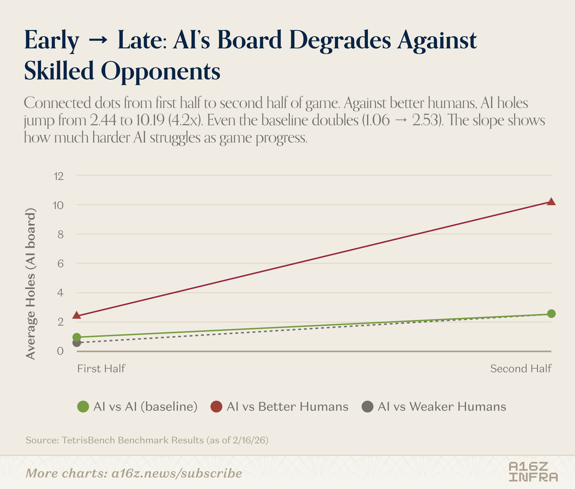 If you’re thinking about benchmarks for planning, coding agents, or long-horizon model behavior, I’d love to chat. You can find the TetrisBench project here. If you’re interested in the full data and trajectories generated from this benchmark or want to explore related analyses, feel free to reach out at yli@a16z.com.