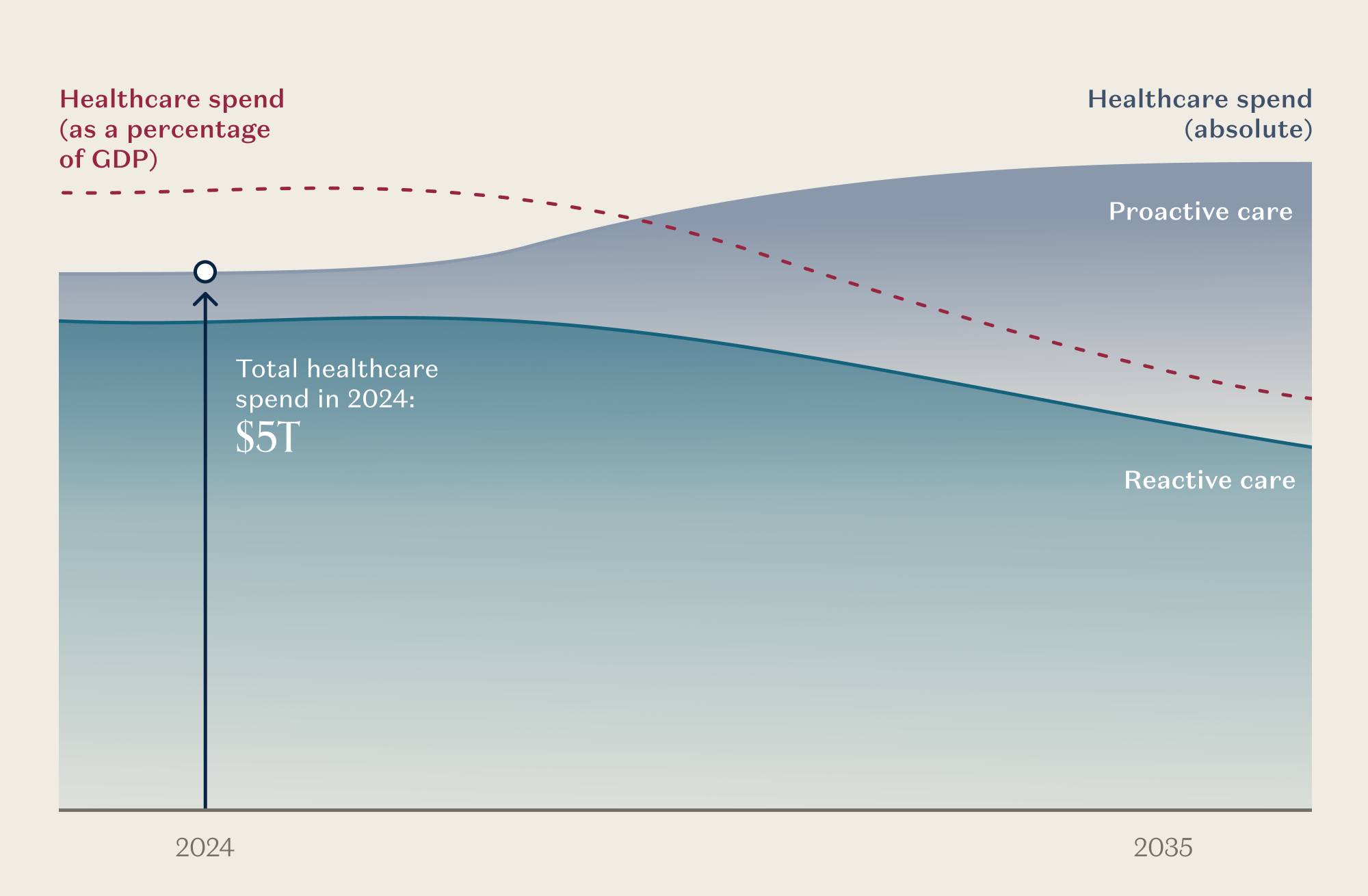 As AI shifts our spend from reactive to proactive, we should be thinking first and foremost about what will improve health outcomes, and then about what we can be consuming more – daily or monthly, rather than annually – as AI changes the economics of care delivery. When more consumption saves money and makes us healthier, let’s increase consumption tenfold! What we want to see is the mix of healthcare spending shift away from costly, reactive care and towards proactive, continual service delivery.