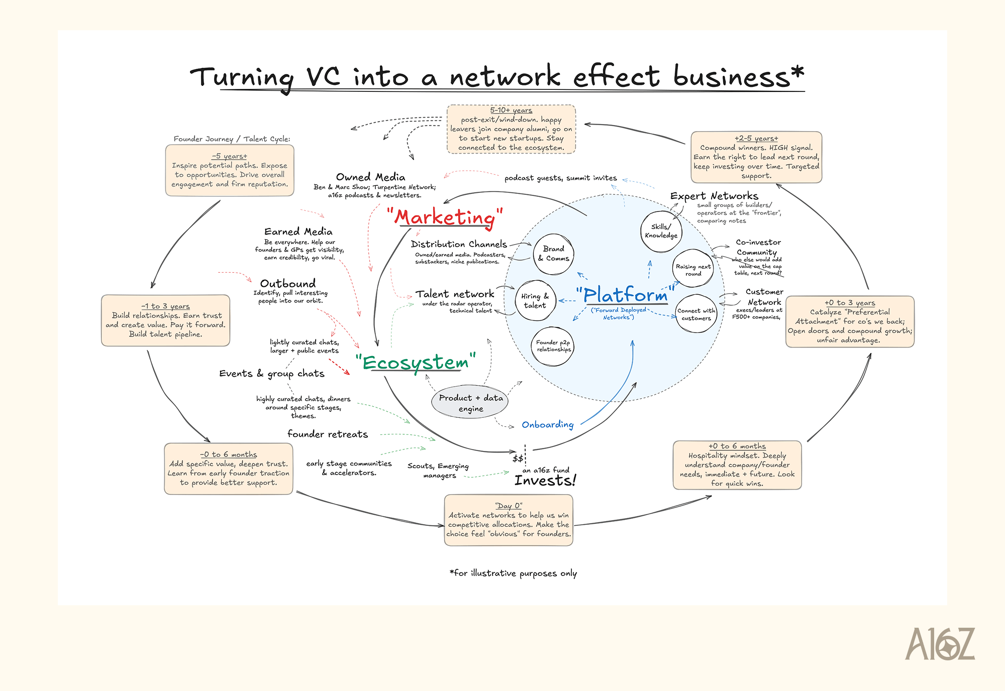 a16z is one among very few who have managed to cross this chasm—delivering intimacy and exclusivity on the front end (direct relationships between vertical fund GPs and founders), AND network effects on the back. Operating a platform that institutionalizes access to resources and talent, at a scale few yet understand.