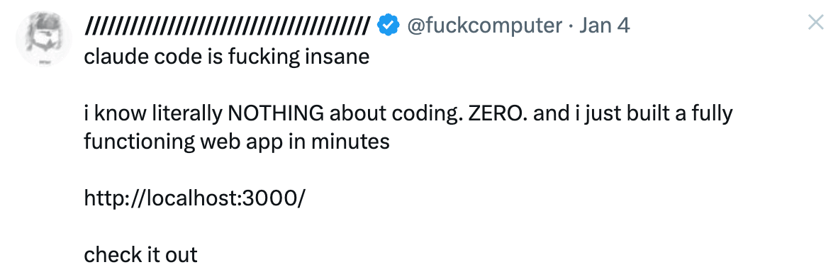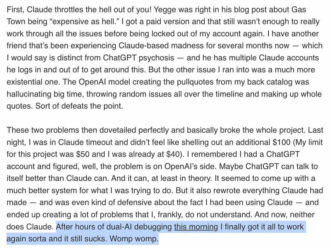 I’m not the only one who has struggled with vibe coding – in fact, we may be the silent majority. I came across a blog post from a writer that captures this perfectly. He was trying to vibecode an app to pull quotes from his newsletter (h/t @broderick). After getting off to a solid start, he quickly ran into problems.