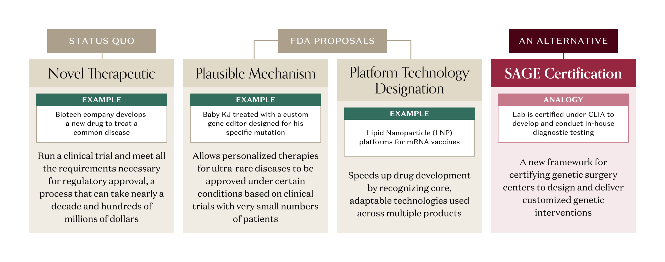 If FDA and HHS were to use enforcement discretion, genetic surgery could live in that same regulatory friendzone. Imagine a CLIA-like approach where FDA creates a new framework for certifying qualified centers capable of designing customized genetic interventions à la Baby KJ: say, a Standards for Advanced Genetic Editing (SAGE) program – “the CLIA for interventional genetics.” Instead of approving every individual edit as a therapy, regulators could use SAGE certification to approve validated platforms (specific prime‑editing systems, delivery vehicles) and the process for designing customized, one-off genetic interventions. Like CLIA, SAGE would make accredited centers, not individual edits, the primary unit of regulation.