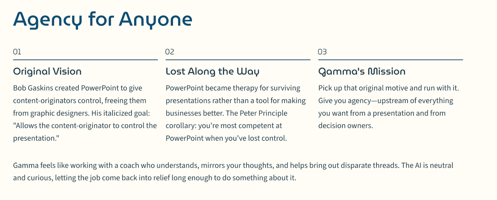 In a world where agency is everything, you don’t want PowerPoint to be your therapist. You want Gamma to be your coach.