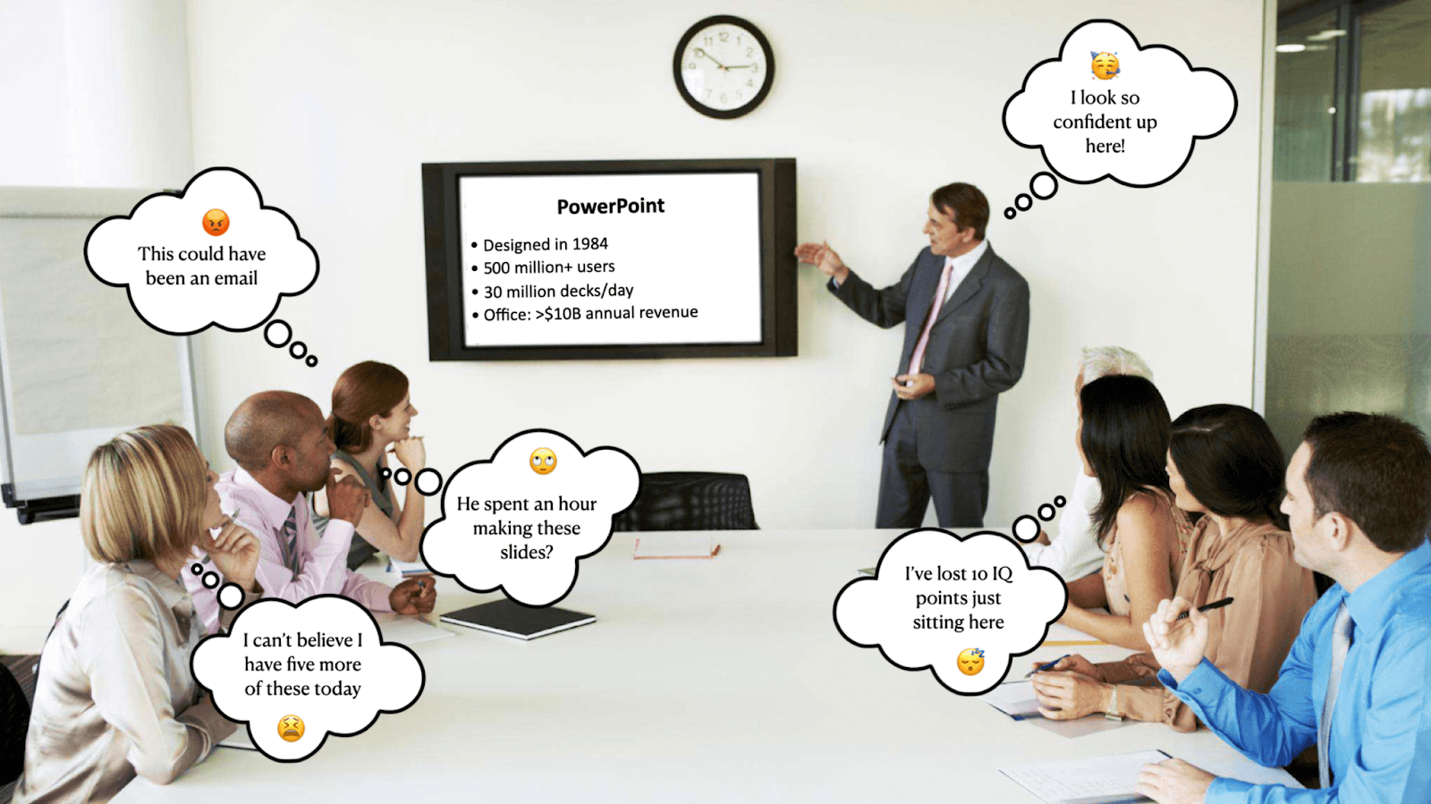 There’s a famous quip called the Peter Principle, which you may know. It goes, “People are promoted within organizations until they reach a level where they’re incompetent at their job; at which point they stay there.” You can imagine a corollary for our modern workplace: “The first job level at which you struggle in the role is the level where you’re most competent at PowerPoint.”