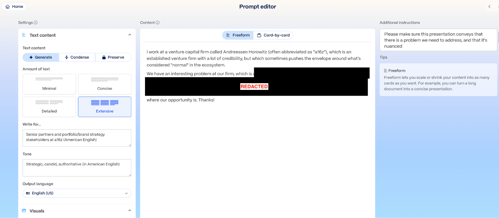 Prior to learning more about Gamma as a part of their fundraising process, I started playing around with the product for the first time – I’d never actually used it before. And man, let me tell you, that initial prompt box (which expands into a more powerful dashboard once you click through) is a powerful format for getting you to actually think through the situation. I tried putting it to work on a problem we’re thinking through on the New Media team right now, and I was absolutely blown away by how effortlessly the product guided me into actually thinking critically about the presentation, and how effortlessly it set our conversation up for success. It made us think better.