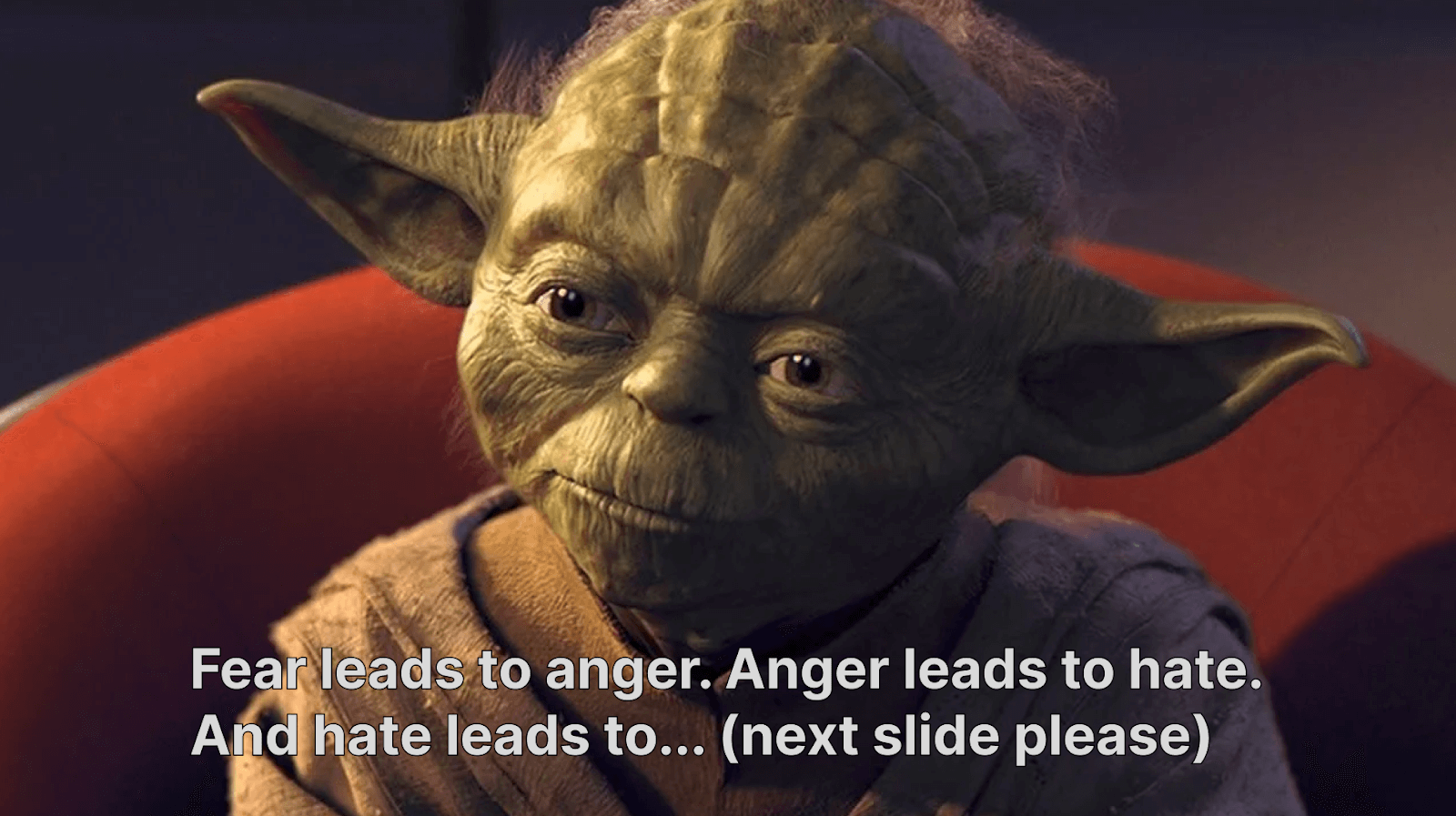 I honestly think this is true, in some sense. Anyone who’s well into a professional career has experienced, at some point, the scary feeling that they have lost control over their situation. This often comes after a promotion, maybe into a managerial or a staff role, where you’re in some small crisis and you must construct a slide deck for a meeting to try and rescue things. This is a tough situation, and I feel for each one of you that’s recalling some such experience from your past life. In that moment, the job-to-be-done of PowerPoint is therapy. It tells you, “we’re going to make it through this, together”: not by solving the situation, but by surviving it, with the divide-and-conquer method into slides and bullet points.