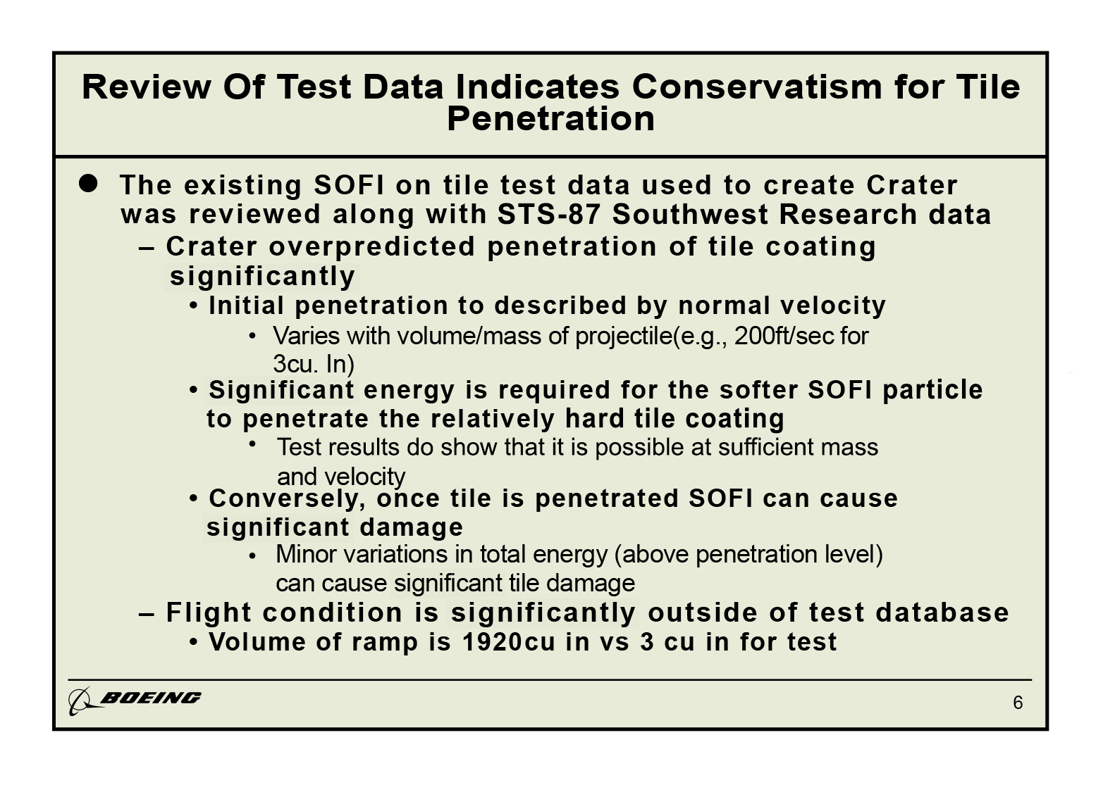 This is a good illustration of learned helplessness. Whoever assembled this slide knew exactly what the stakes were and what the data (didn’t) show; but reached a slide title all the same: “Review of Test Data Indicates Conservatism for Tile Penetration”. The mandate was the message.