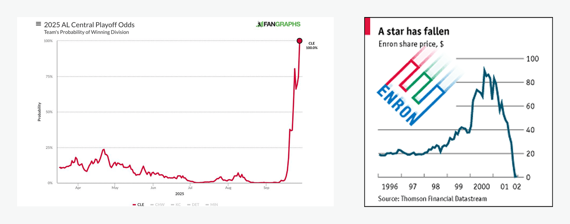You can tell amazing stories with these images. Just by looking at changing probabilities, you could tell a story about collapse, about redemption, or about an underdog beating the odds. (Kurt Vonnegut famously gave names to many of these stories: like “man in a hole”, “boy meets girl”, and “from bad to worse,” each with their own shape.) These images are a kind of meme: they compress a lot of information into a tiny space, and faithfully transmit the story intact when shared.