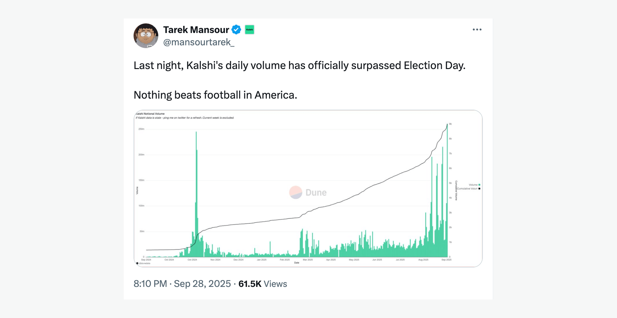 What changed, if anything, over the past two years? There probably wasn’t one silver bullet. The 2024 election definitely helped: Americans have a long history of betting on elections, and prediction market volume grew 42-fold between early June and the week of the election. But it didn’t fade once the campaign was over.