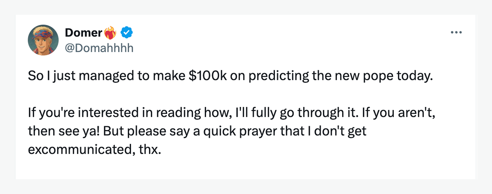 A day after the white smoke cleared, @Domahhhh on X shared a real gem with the timeline: the play-by-play breakdown of his thought process and his bet sizing, in both the days leading up to conclave and in the critical minutes between the decision and the reveal.