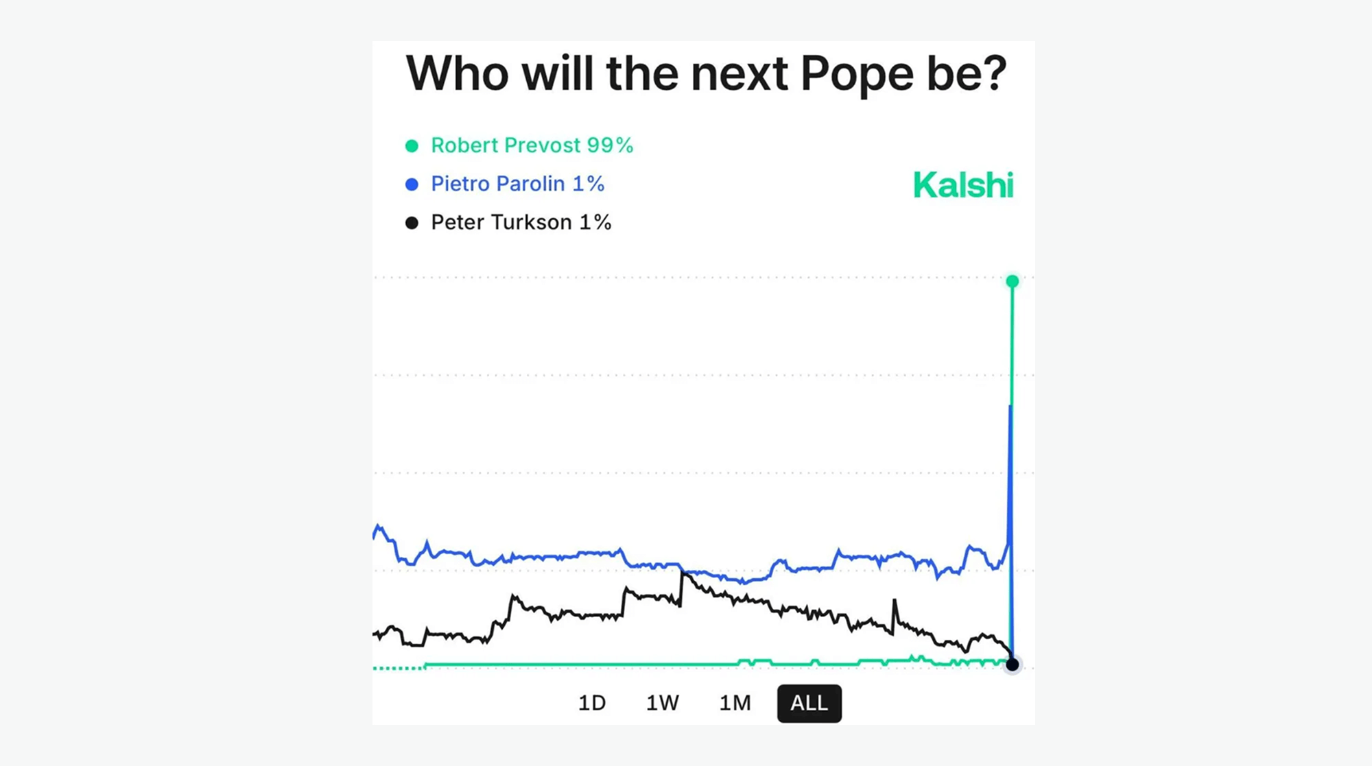 Betting on the Pope was supposedly the “original prediction market”, and this most recent time around saw a glorious return to that tradition. It was a great moment for Catholics around the world, as Cardinal Robert Prevost assumed the first American Papacy, as Pope Leo XIV. And it was a great moment for betting markets too, as few people had considered him a viable candidate: most of the attention had been focused on frontrunners like Pietro Paolin and Luis Antonio Tagle.