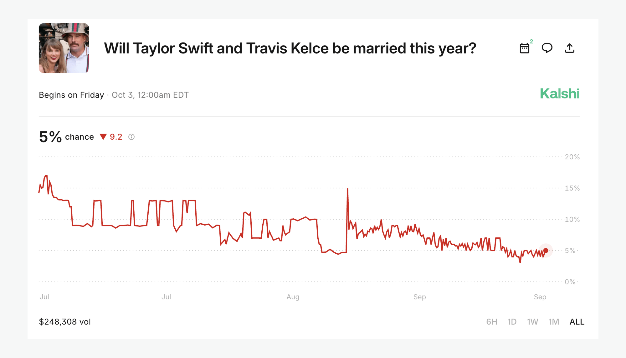 For a great example, look at this Kalshi contract for the pop culture question of the year: “Will Taylor Swift and Travis Kelce get married in 2025?” If you look at the chart, you’ll see two important things happen on August 26th, when Swift and Kelce announced their engagement on Instagram. First, a spike in the odds; and second, a huge increase in liquidity as people start paying attention to the contract. While some amount of the liquidity jolt would’ve arrived regardless, there’s no doubt that these shared screenshots, at critical moments, constitute viral awareness of the contract itself, and a top-of-funnel draw into the bet. This kind of “fourth wall break,” where the broader audience suddenly gains awareness of the meme (or, more properly, of the reason to care about the contract at all), will give an interesting new meta element to future stories.
