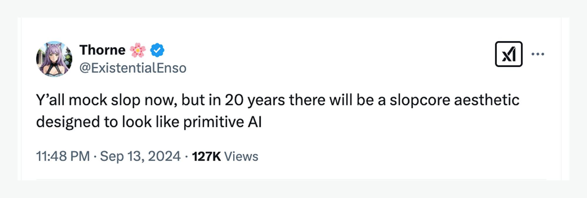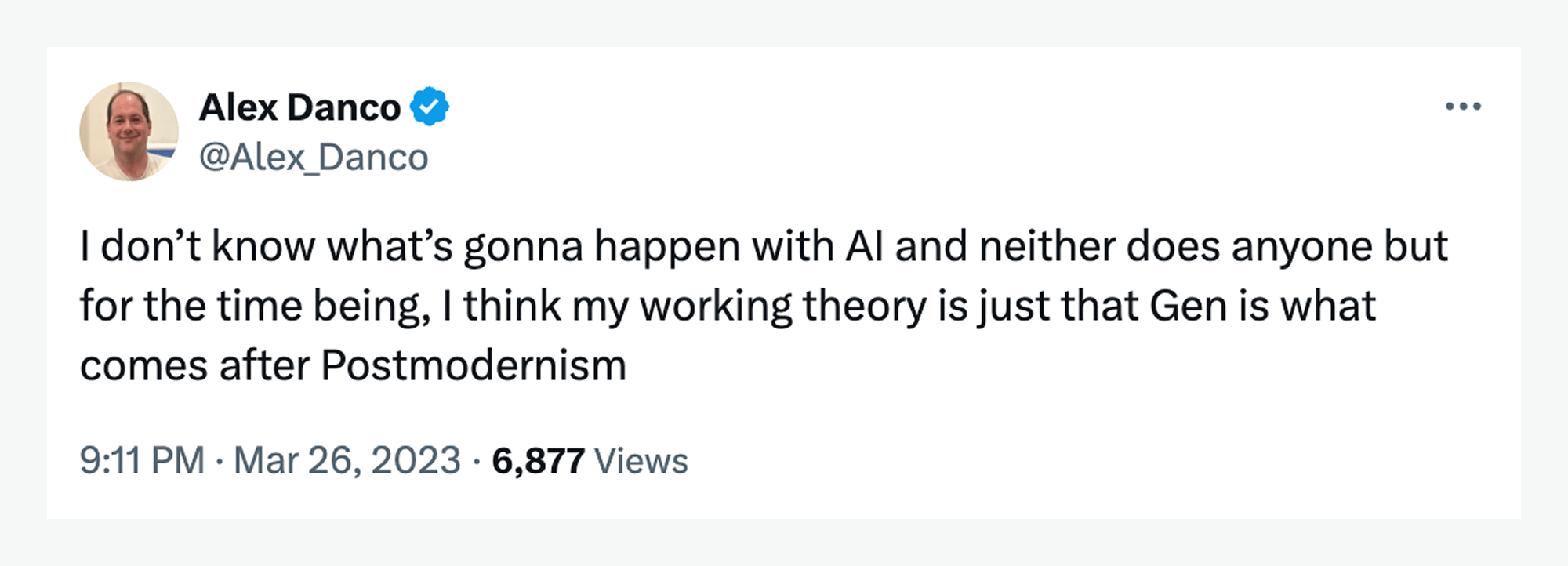 I remember the moment when AI generated art suddenly burst into public consciousness with Dall-E and Midjourney, and everyone gasped, “this is the beginning of a completely new kind of art!” I think with hindsight we will look at it with nostalgia, because it’ll actually be the last postmodern visual art form. It’s the final, perfect form of “everyone gets to consume the version they would like!”, at the moment it became culturally obsolete.