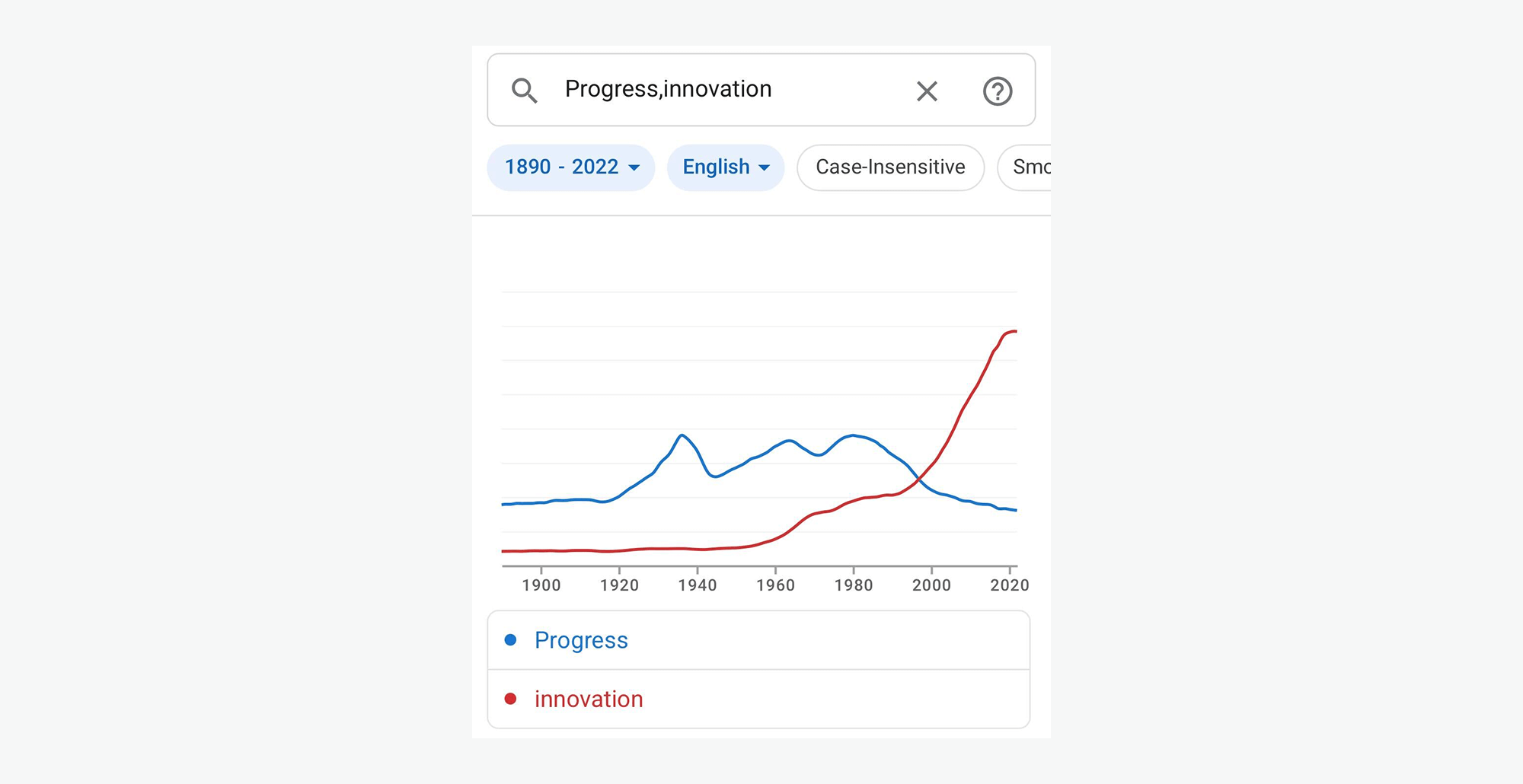 Modern and postmodern actors think about progress in very different ways. Modernism understood progress as something that simply happened; perpetually and unstoppably. And that way of thinking about the world became a self-fulfilling prophecy: the early 20th century delivered on those promises, as houses lit up with electricity and living standards shot up everywhere. Then in the middle of the 20th century, something interesting happened: we stopped talking about “progress”, and found a new word, “innovation”.