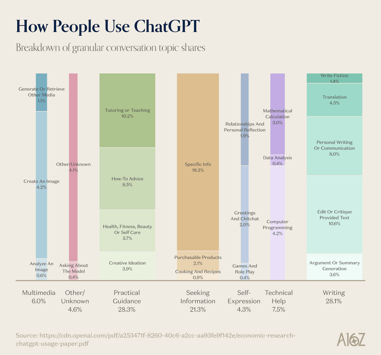 To understand why most people don’t pay for AI subscriptions, it helps to understand what people use AI for. Last year, OpenAI published data on exactly this.