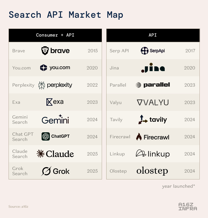 By being a clean and easy-to-use developer interface, these search APIs can then be hooked up directly into agent workflows to provide access to external data and synthesize information directly on top. This results in customers, specifically developers, building their own products today with external search integrated: CRMs with automatic enrichment from the web, coding tools that can access live docs, etc. (more on use cases below). There are nuances here: some teams prefer an all-in-one, end-to-end solution from a single provider, while others opt to assemble their own stack — using one solution for search, another for reasoning, and so on. Actually, there are nuances all the way down: some API providers actually use external indexes, rather than building their own in-house.