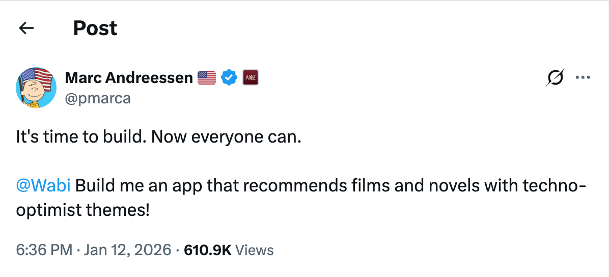 If you’ve been on X the past few weeks, you’ve seen it happening: Tobi built a custom MRI dashboard that (according to the professionals) should’ve required commercial software to view. Marc is generating a techno-optimist movie and novel recommender with Wabi. Levelsio and Joe Weisenthal are architecting apps live for an audience. People are shipping entire ad campaigns from the CLI. If you previously had excuses for not building something, they just got a lot less convincing.
