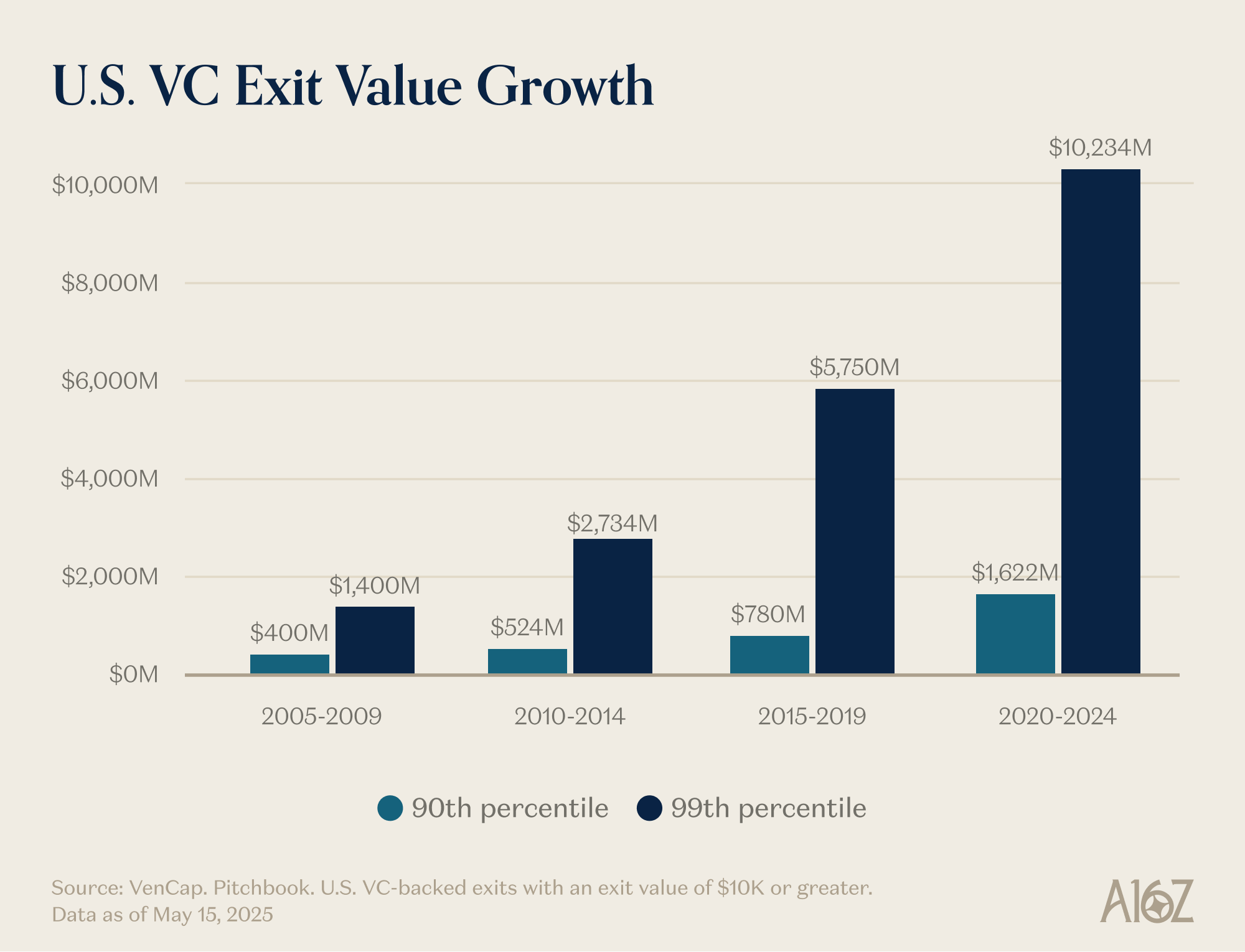 So the winners are far bigger than they used to be, and they need to raise much more money than they used to, often out of the gate. So of course the venture industry has to be much bigger to meet that need. That scaling makes sense, given the size of the opportunity set. If VC was too big for the opportunities in which venture capitalists are investing, we would expect to see the largest firms see bad returns. But we haven’t seen that at all. During the same time of expansion, the top venture firms have repeatedly returned extremely strong multiples—as have the LPs who’ve been able to enter them. A famous venture capitalist used to say that you could never have a 3x return on a $1 billion fund: it was just too big. Since then, certain firms have more than 10xed a $1 billion fund. Some people point to the lower-performing firms to indict the asset class, but any power-law industry is going to have massive winners and a long tail of losers. The ability to win deals without having to win on price is why firms can have persistent returns. In other major asset classes, people sell to or take a loan from the highest bidder. But VC is the canonical asset class where you compete on other dimensions besides price. VC is the only asset class with meaningful persistence of firms in the top decile.