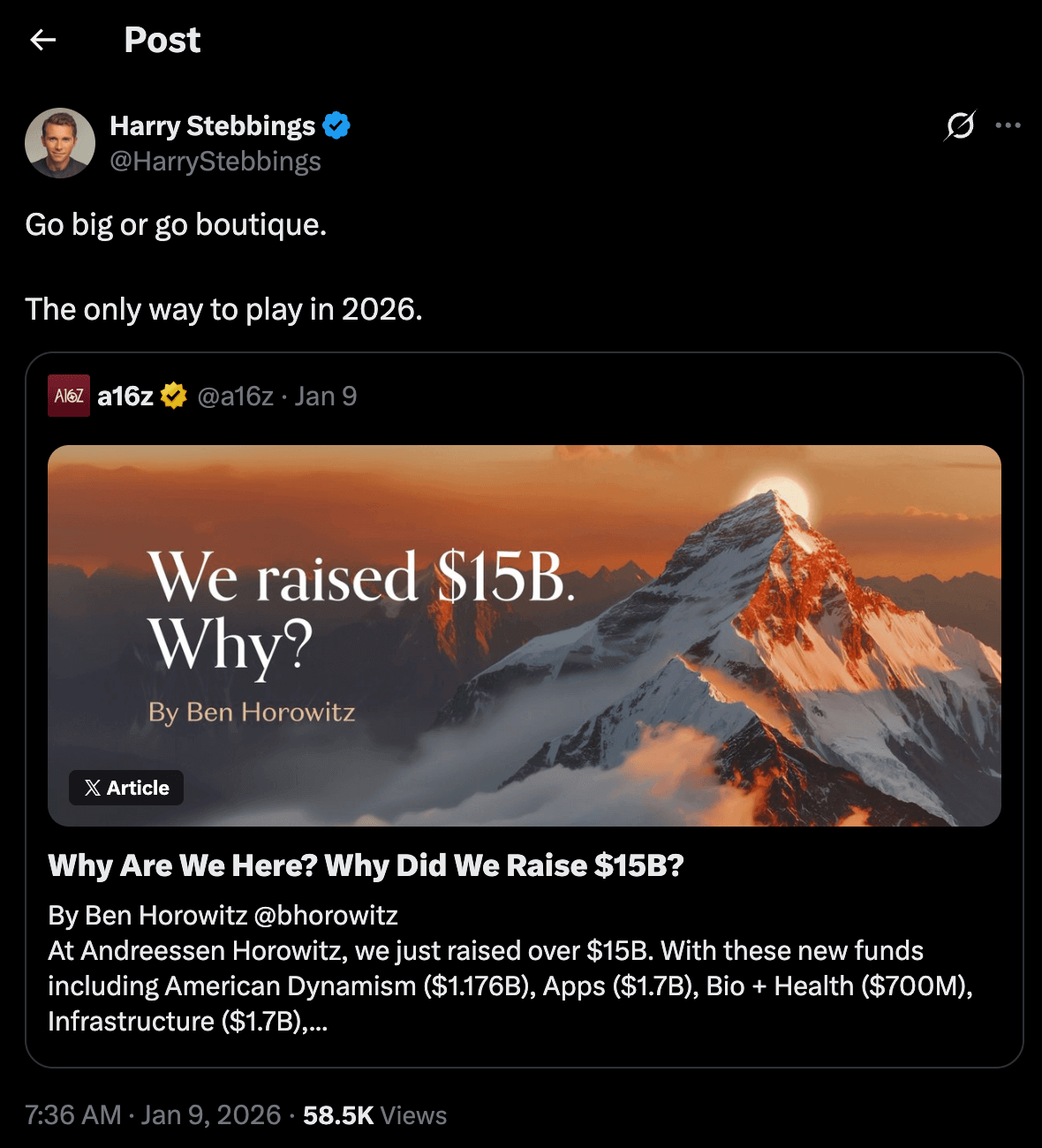 Scaled and boutique will both be fine, it’s the middle that’s in trouble: the funds that are too big to afford to miss out on the mega-winners, but too small to compete with bigger firms who can structurally offer a better product for founders. a16z is unique in that it’s both sides of the barbell—a collection of specialized boutique firms benefiting from a scaled platform team.