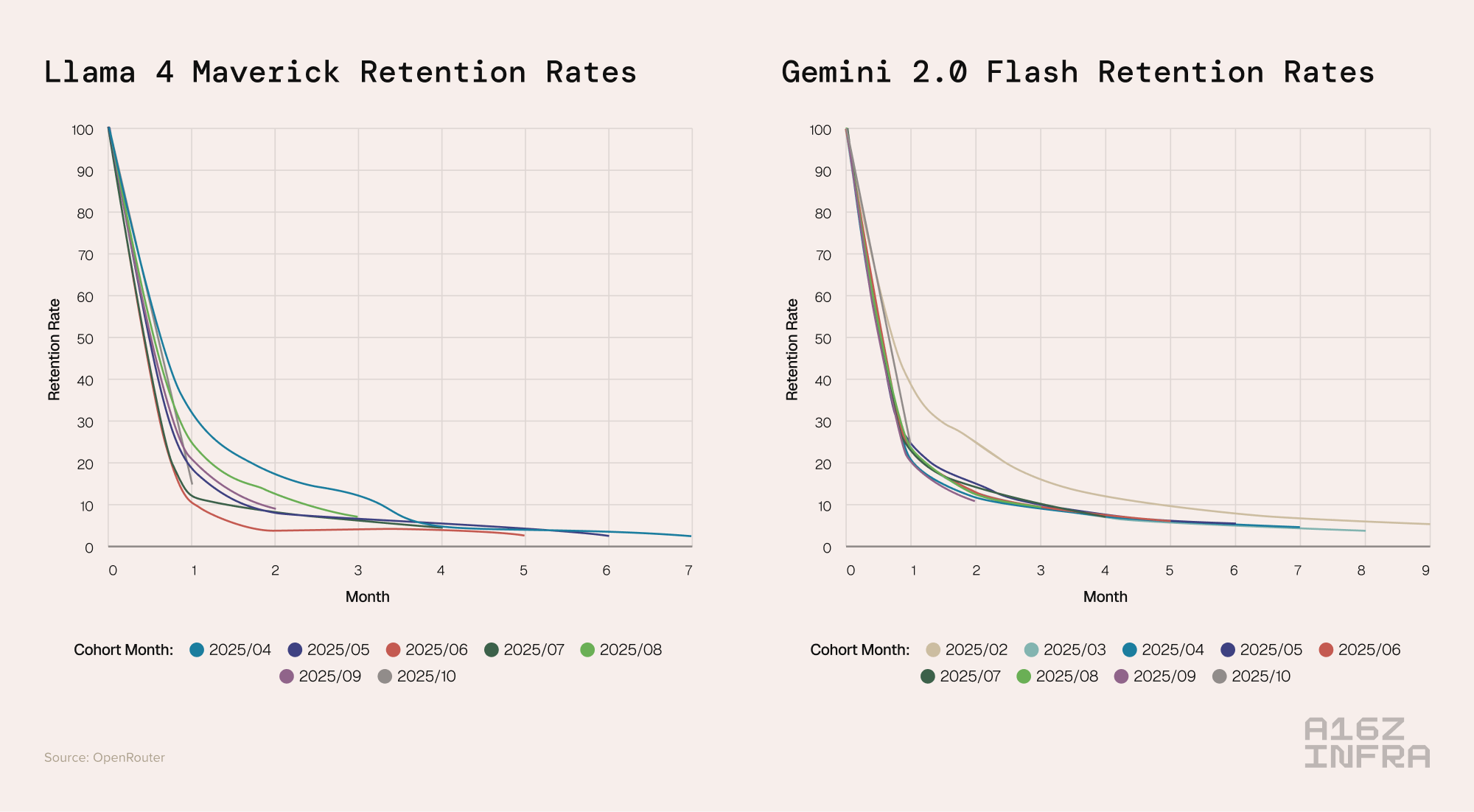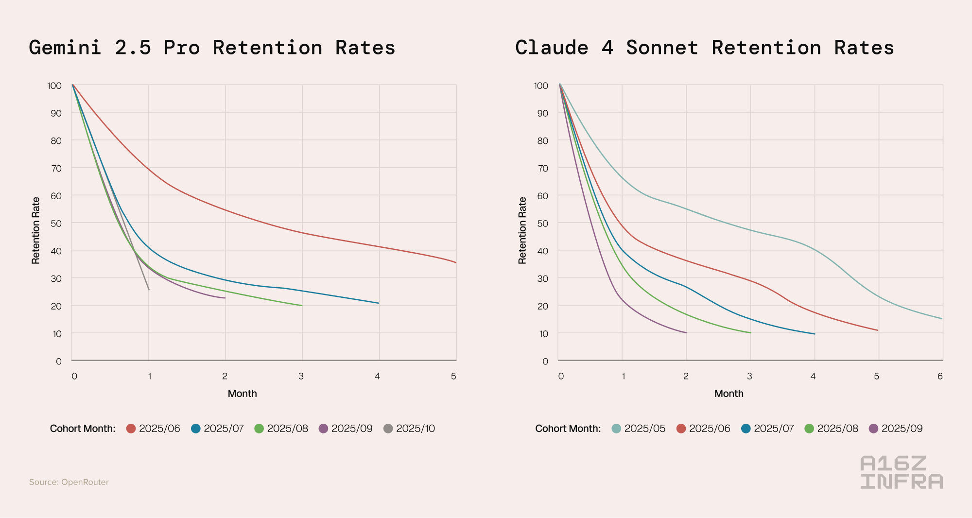In essence, when an AI model debuts with a clear technical edge, it has a brief window to hook a foundational cohort. In that window, which may only last until the next big model launch, the first users to “try on” the model either find a fit or they don’t. If they do, they become power users who keep the product alive (and keep usage high) long after the hype moves on. If they don’t… well, then every cohort after looks the same: fleeting and fickle.