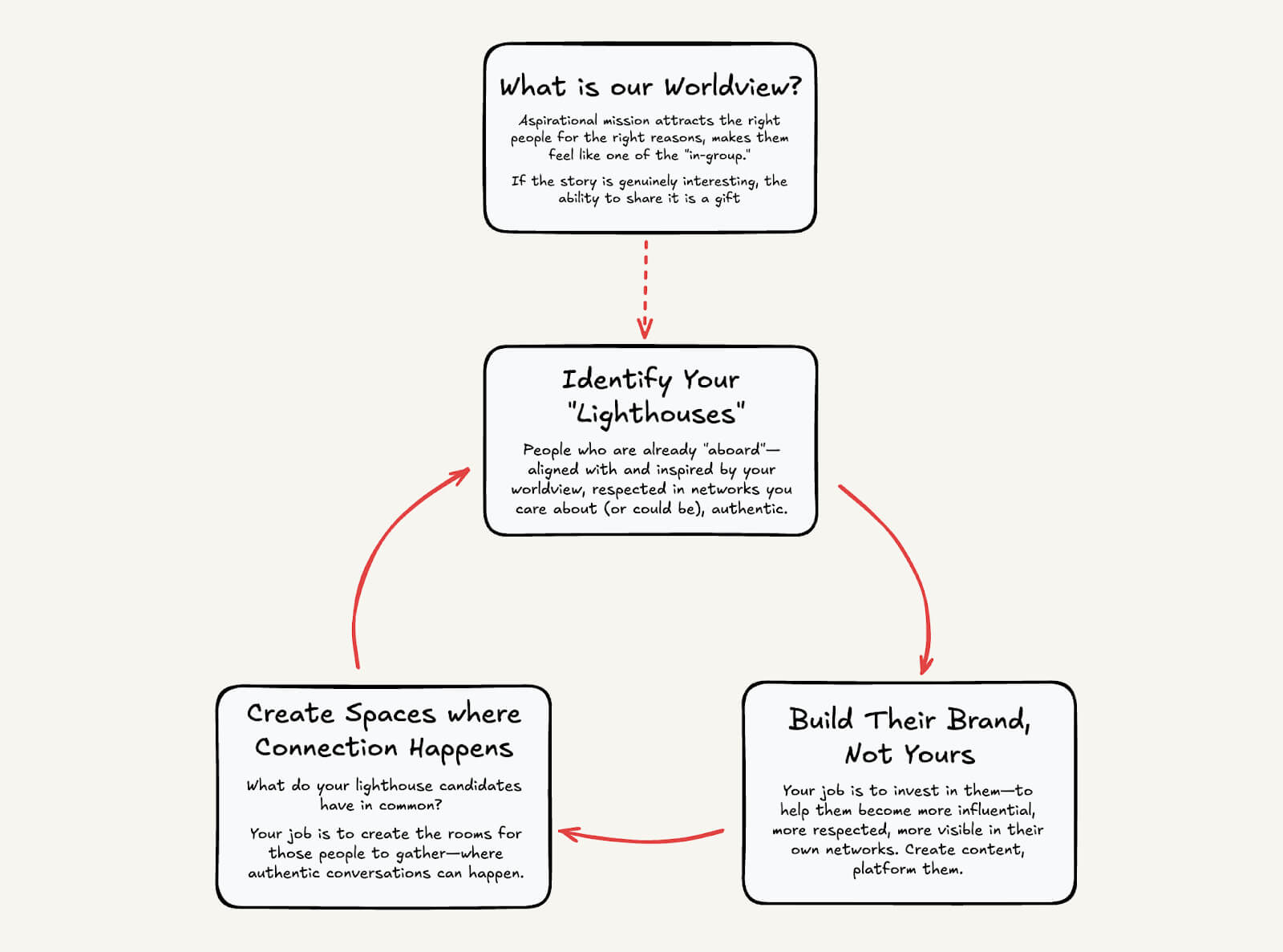 You can get started on this early. Think about what your lighthouse candidates have in common. Let’s say your customers are marketing leaders in Europe. Maybe it’s that they’re all struggling with similar operational challenges but have never had a room to realize that. Your job is to create the rooms for those people to gather—where authentic conversations can happen. Regular dinners, small forums, intimate gatherings organized around genuine shared interests.