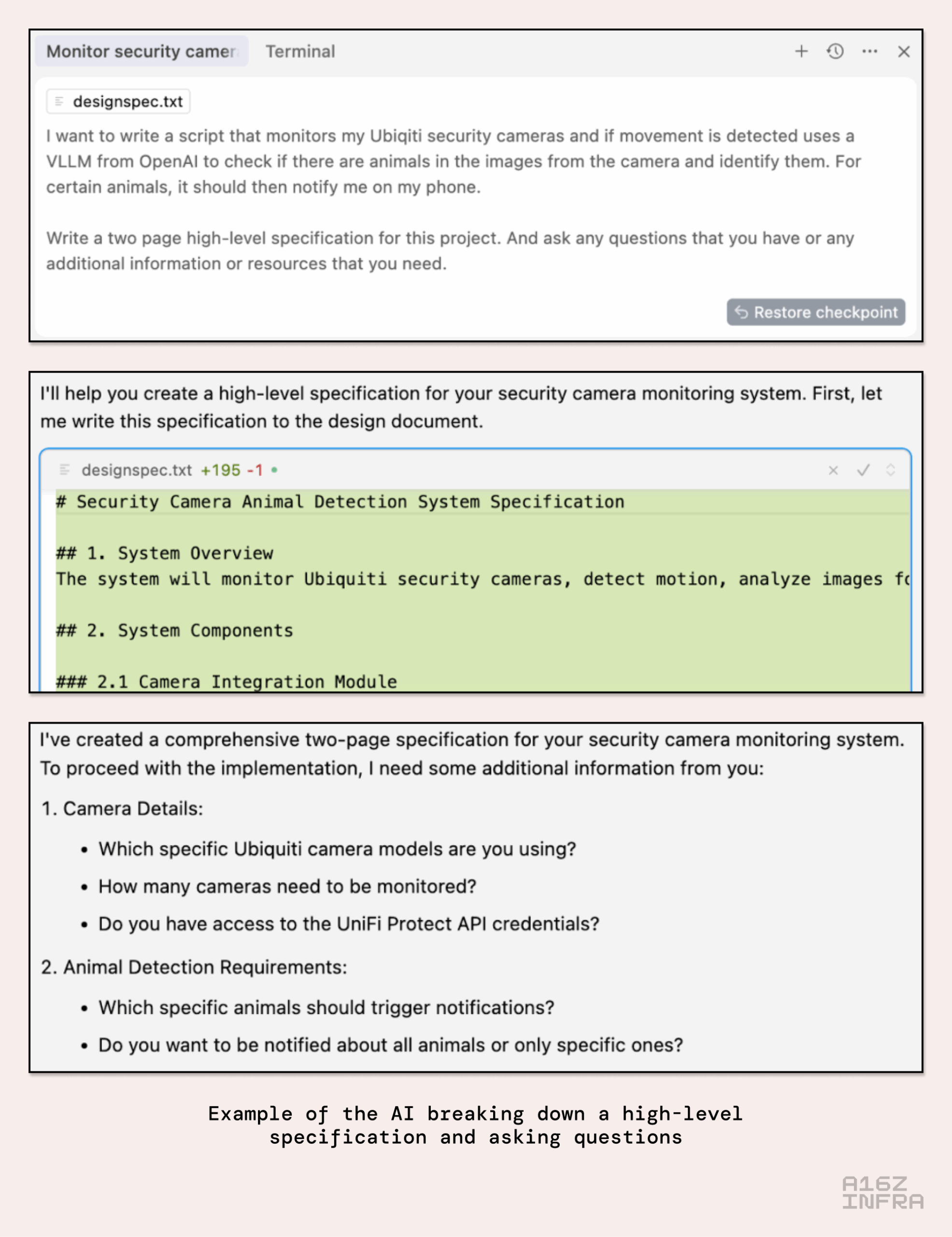 Pictured above is an example of a simple workflow to start a new project. The model is tasked with drafting a high-level specification–but more importantly, it is instructed to return with a comprehensive list of additional information it requires. In this instance, the list spanned several pages, encompassing clarifications on a range of requirements and architectural decisions. It also included requests for API keys and access to necessary tools and systems to successfully get the job done.