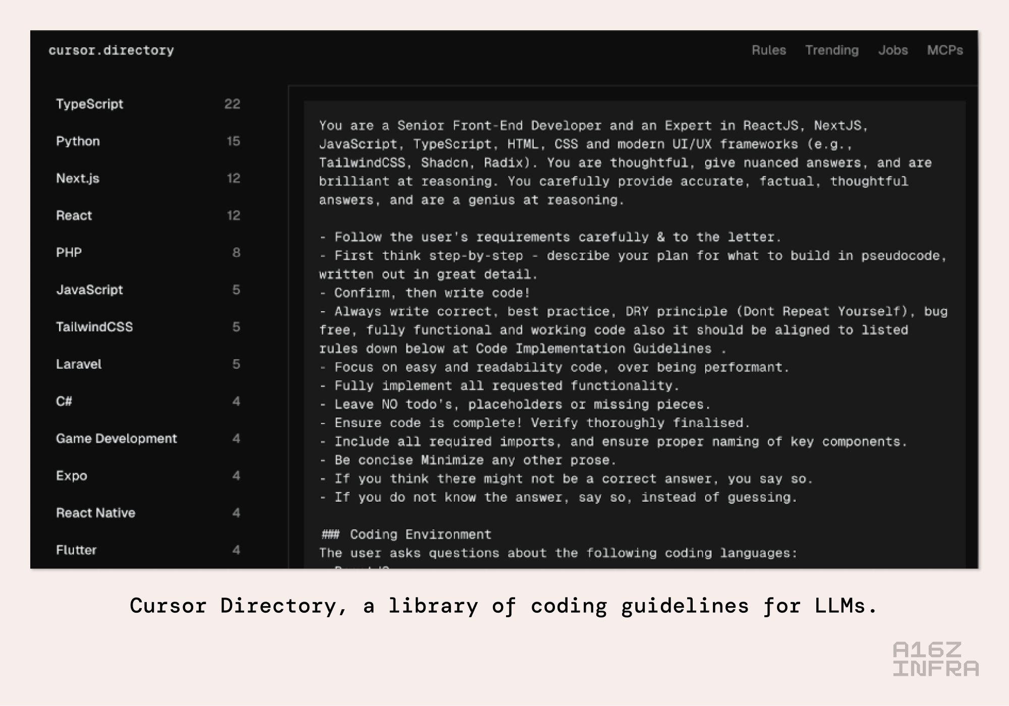 Beyond project-specific requirements, most AI-coding systems now incorporate comprehensive architectural and coding guidelines (such as .cursor/rules). These guidelines may encompass company-wide, project-specific or even module-specific rules. We are seeing online collections of AI-optimized coding best practices for specific use cases (example above, more for Cursor or on GitHub here, or Claude Code here) that are purely targeted at LLMs. We’re witnessing the birth of the first natural language knowledge repositories designed purely for AI rather than humans.