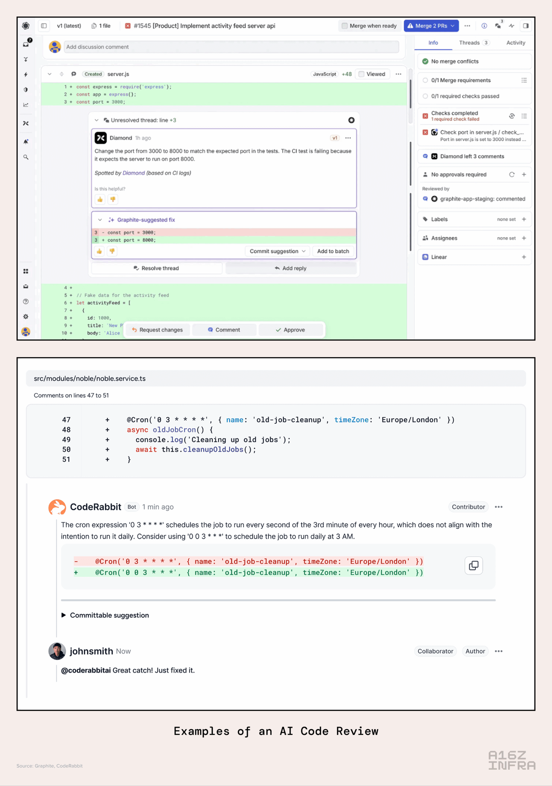 Source Code Management System Integration enables AI to review issues and pull requests and to participate in discussions. This integration leverages the collaborative nature of source control management, where discussions around issues or pull requests provide the AI with valuable context for implementation. Additionally, the AI assists in reviewing developer pull requests, focusing on correctness, security, and compliance. Examples include solutions from Graphite and CodeRabbit.