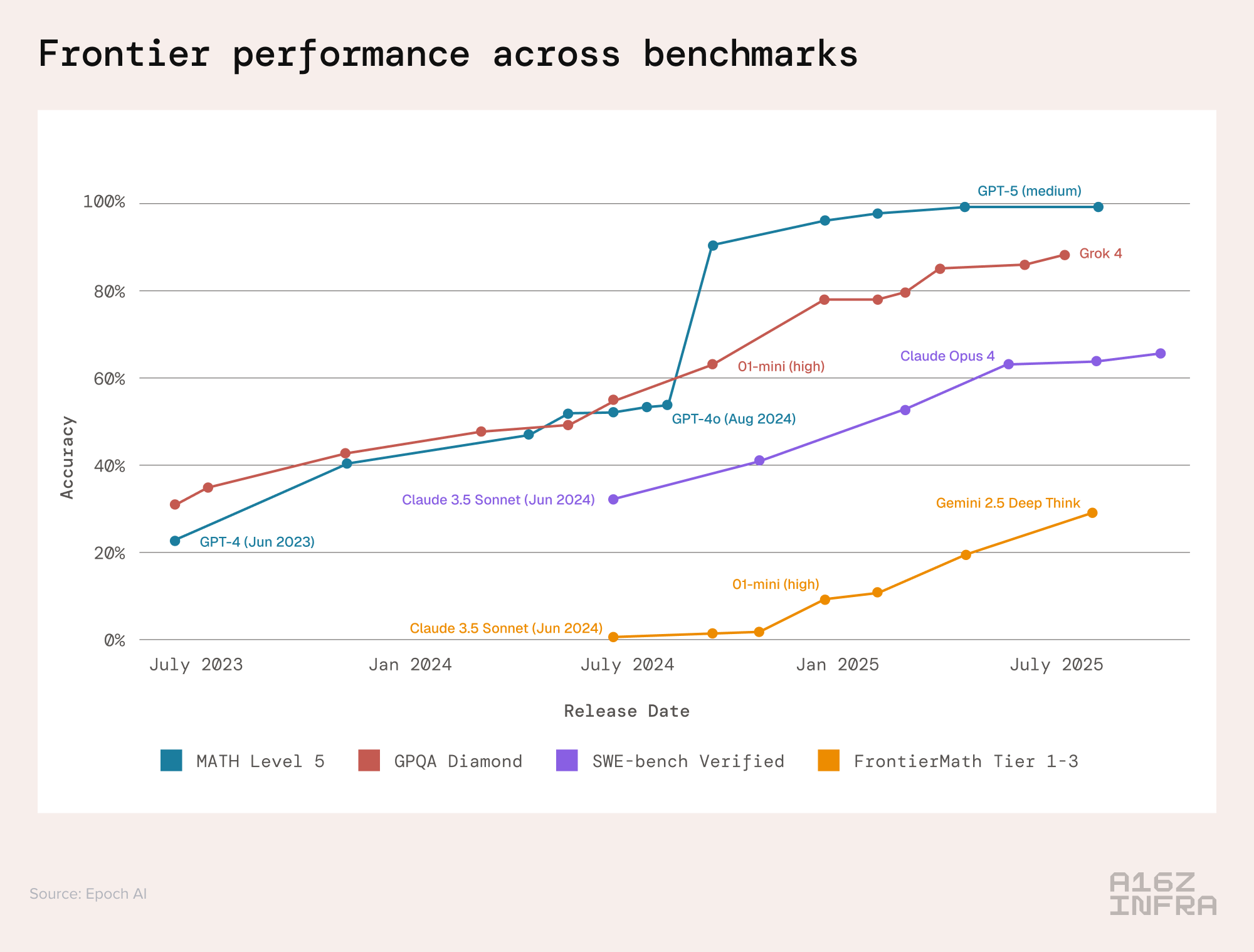 Of course, this assumption (and subsequent confrontation with reality) is not unique to diffusion models. Frontier lab LLMs also followed a pattern of step-function improvements from 2023-2025, and then saw performance begin to level off across a variety of benchmarks. When this happened with LLMs, we saw major foundation labs begin to specialize in specific verticals, and the overall AI product layer take off; in fact, we wrote about this trend earlier this year.