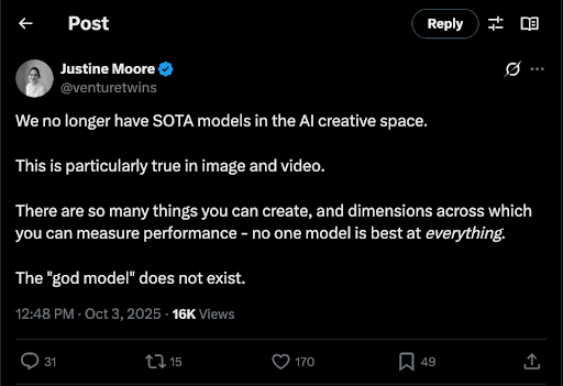For the past few years, frontier diffusion model labs have consistently released models that outperform prior generations on major benchmarks. This progress inculcated an assumption among researchers, creators, and (yes) VC’s like myself: a “god-tier” model that is great at everything would eventually emerge, and become the default provider for a multitude of different video use-cases. But this year, the assumption was challenged: Sora 2 was released last month, and appeared below Veo 3 on benchmarks like LMarena. There’s a sense that progress might be slowing on the diffusion model level, and the concept of “SOTA”, at least when it comes to video models, may not actually exist.