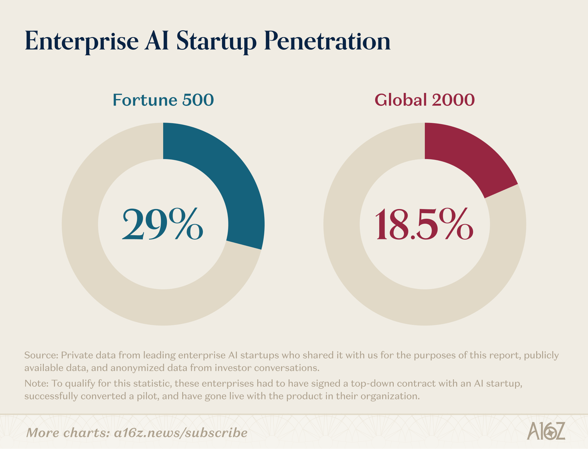 AI has upended that norm. OpenAI launched ChatGPT in November 2022 and immediately spotlighted the potential of AI to consumers and enterprises alike. In doing so, they unleashed a storm of interest in AI that previous generations of technology never elicited, and large enterprises have been willing to take a bet on newer products earlier than they ever have before. The result: just over 3 years later, almost one-third of the Fortune 500 and one-fifth of the Global 2000 have real enterprise AI deployments in their organizations. (Data Methodology: This data is aggregated from the leading enterprise AI startups and encompasses private data from companies who shared it with us for the purposes of this report, as well as from publicly available data and anonymized data analyzed from the thousands of conversations we have at a16z with both startups and large enterprises.)