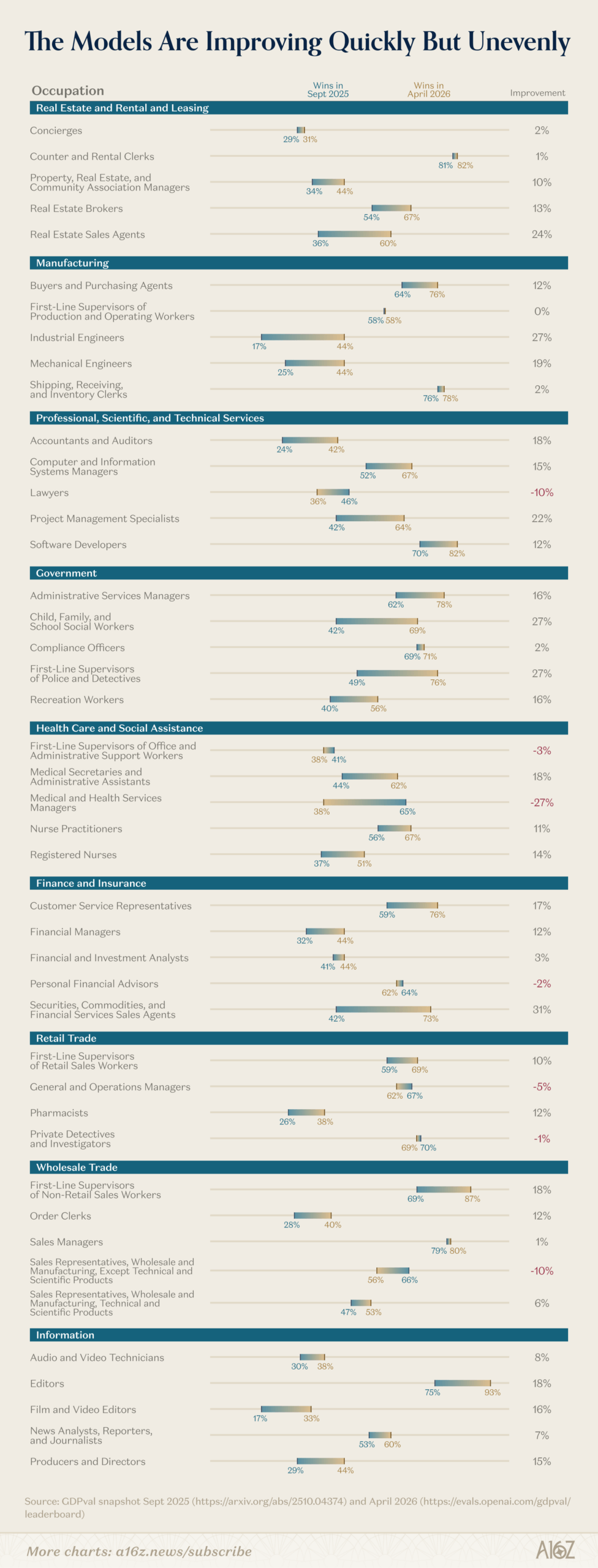 The most notable finding here is that the model capabilities are improving fast. There are several domains that have shown dramatic improvements in the last 4 months — with accounting and auditing showing nearly a 20 percent jump on GDPval and even domains like police / detective work showing a nearly 30 percent improvement. We expect these jumps to yield compelling new products and companies in their relevant domains. In addition, the model companies have made clear declarations about their intentions to improve core capabilities in economically valuable work, with core work being done on spreadsheet and financial workflows, computer use to tackle thorny work on legacy systems and industries, and meaningful improvements on long-horizon tasks that opens up a whole new class of work that can’t easily be carved up into short, digestible bits.
