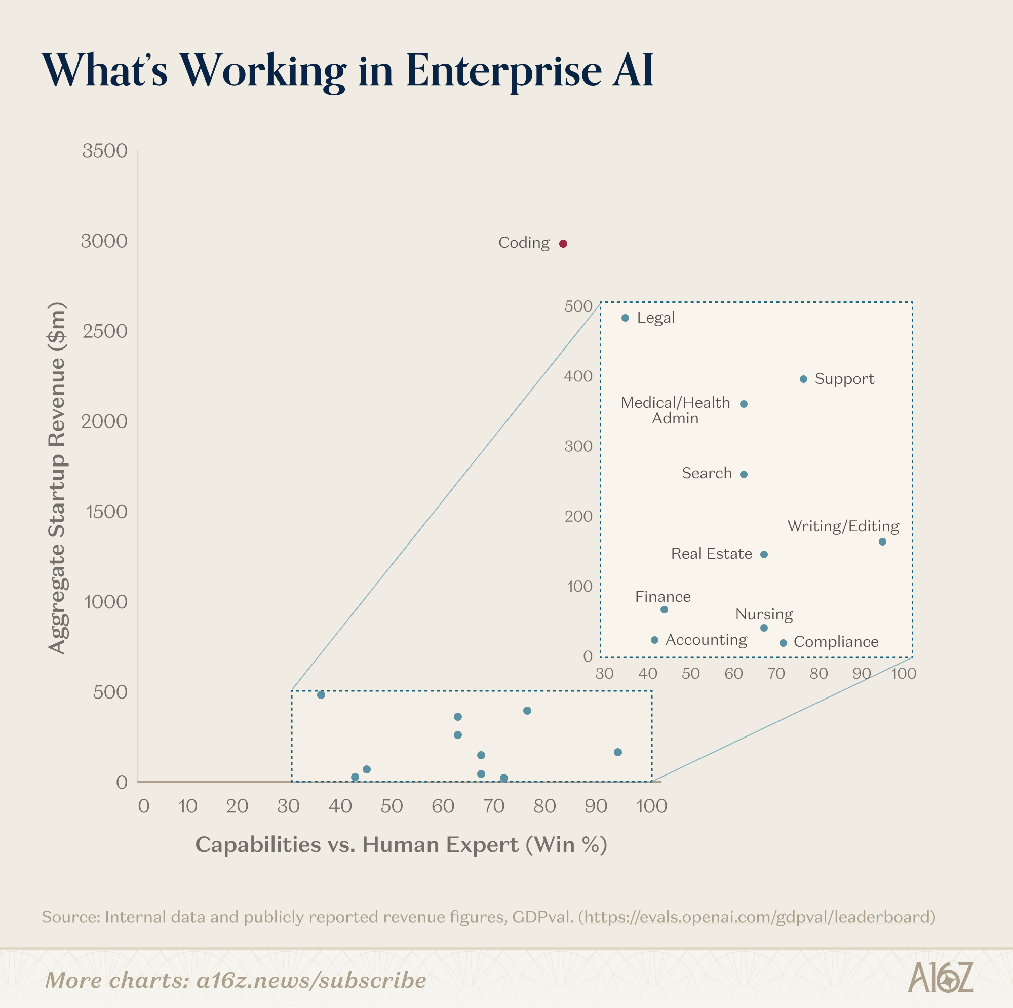 The industries that have adopted AI with fervor so far have a few similarities: they are text-based, involve rote and repetitive work, have natural human-in-the-loop involvement to inject human judgment, limited regulation, and have clearly verifiable end outputs (e.g., code that runs, a resolved support ticket). Many industries don’t have these properties. They either deal with the physical world, rely heavily on interpersonal relationships, have clear coordination costs across many stakeholders, impose regulatory or compliance hurdles, or lack verifiable results. And while revenue momentum and model capability are clearly correlated, in domains where the model capabilities are theoretically at sub-50% win rates compared to a human (such as in the case of law), companies like Harvey have still been able to get market share rapidly through copilot offerings to enhance individual legal work, and then continuously improve their core product offerings as the models evolve.
