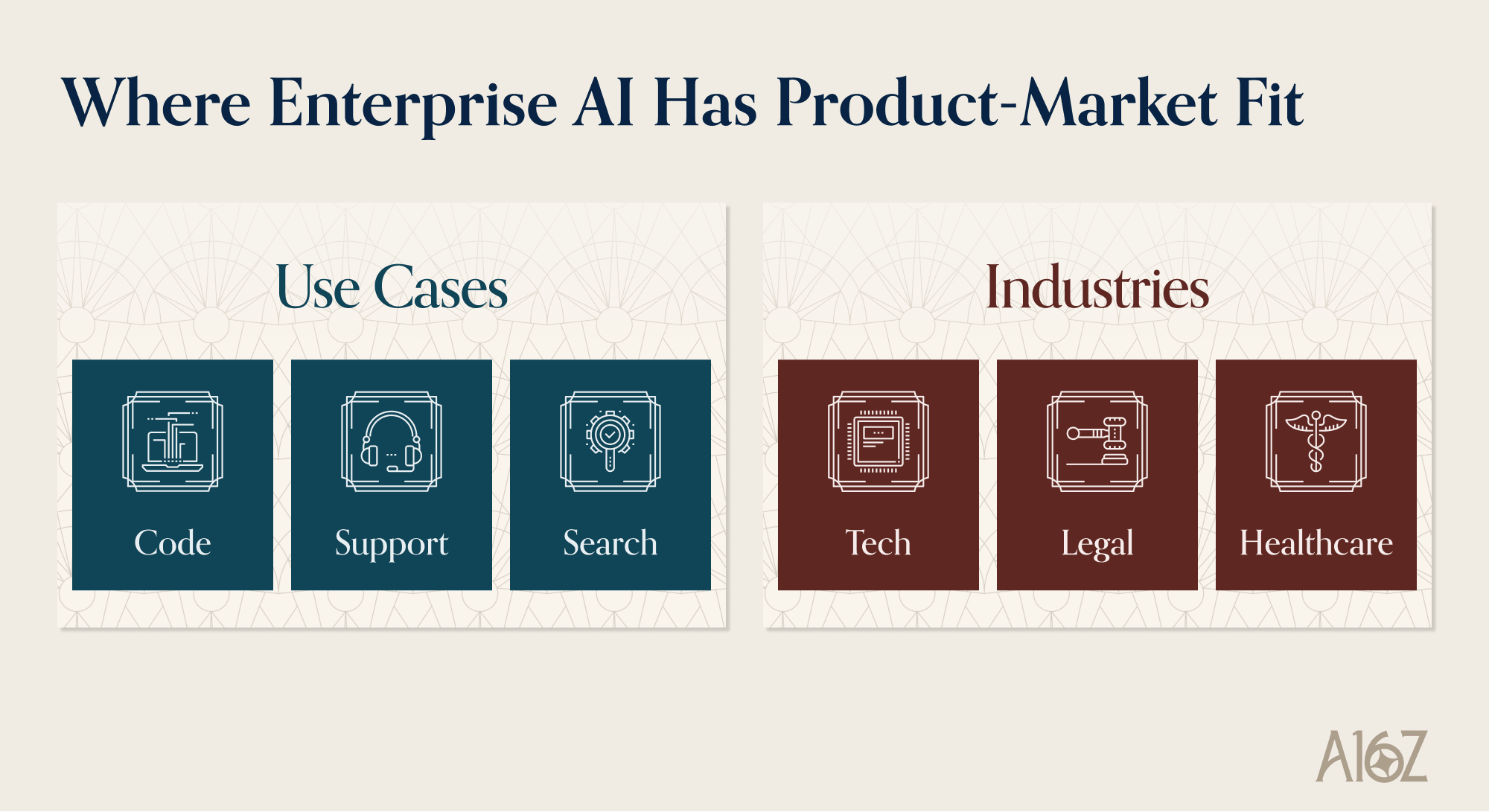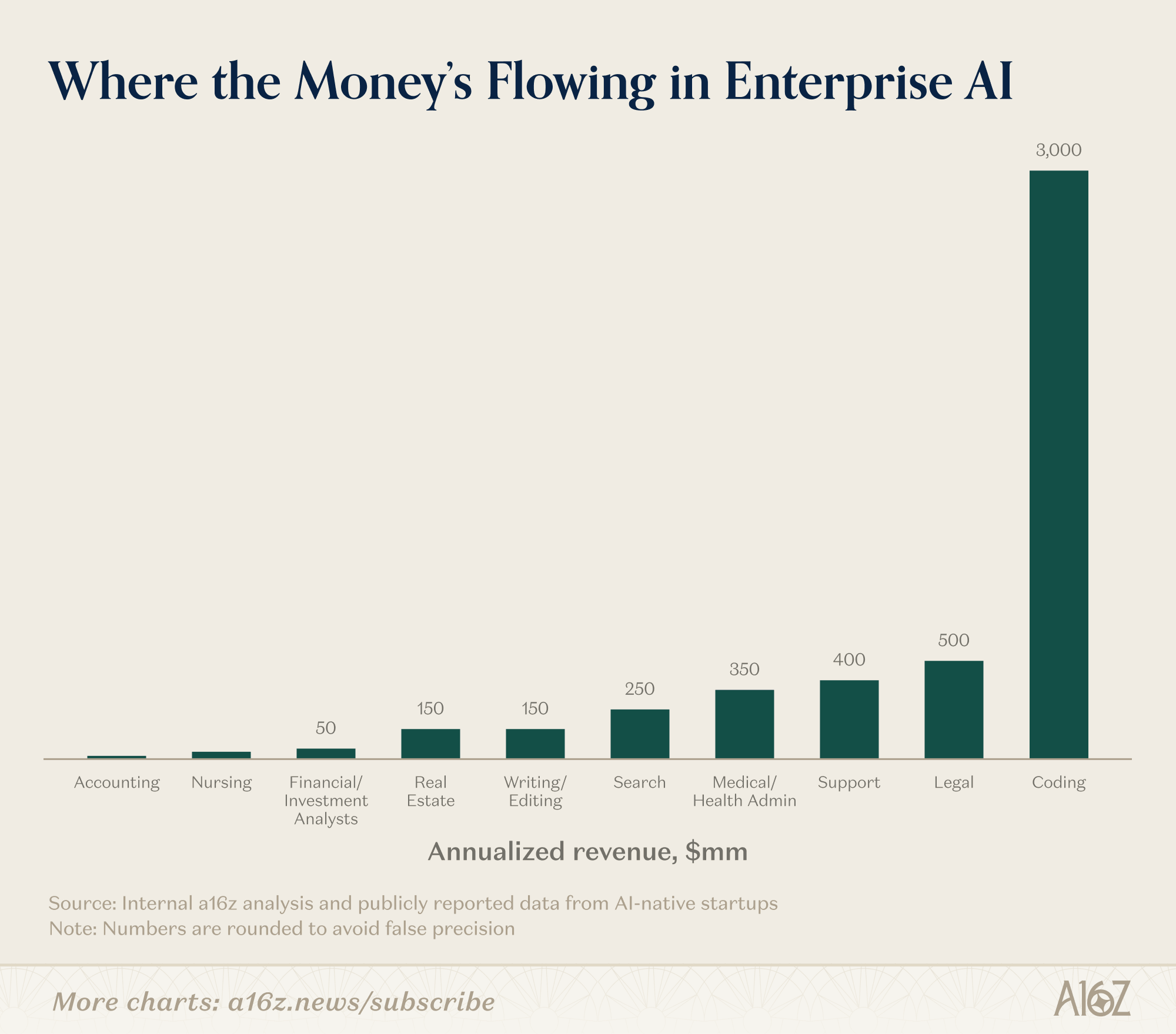 On the revenue momentum, enterprise adoption of AI is dominated by a clear set of use cases and industries. Coding, support, and search represent the lion’s share of use cases by far (with coding being an order-of-magnitude outlier even among this set), while the tech, legal, and healthcare sectors have been the industries most eager to adopt AI.