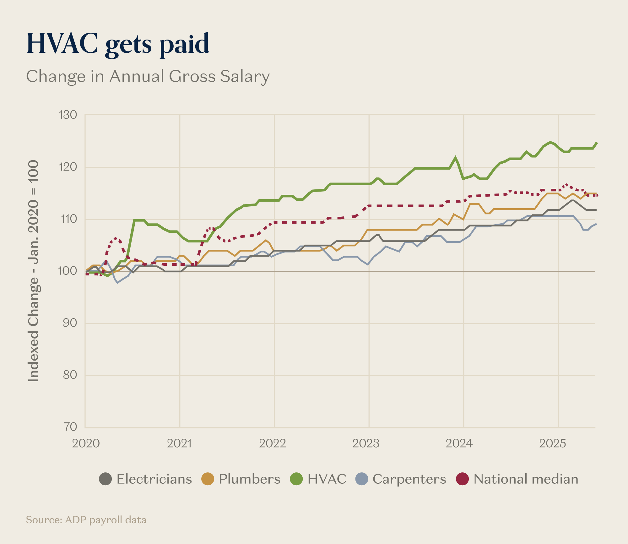 But there’s an interesting spillover effect. The more jobs and opportunities created by the productivity boom, the more wages increase in other industries, who at the end of the day all have to compete in the same labor market. If you can make $30 an hour as a digital freelance marketer (a job that did not exist a generation ago), then you won’t accept less than that from working in food service. And if you can make $150 an hour installing HVAC for data centres, you’re not going to accept less from doing home AC service.