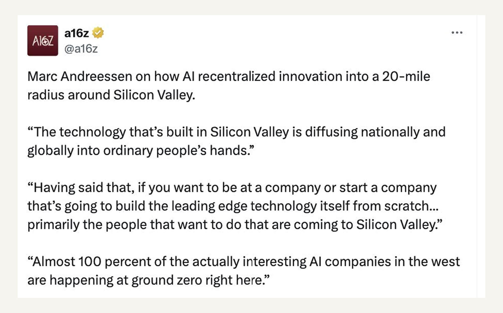 The first thing that happened is that the opportunity cost of not being in Silicon Valley went way, way back up. For every reason that the 2010s was a period of stability for product building, and where company-building best practices diffused out democratically into the world, today the exact opposite is happening: