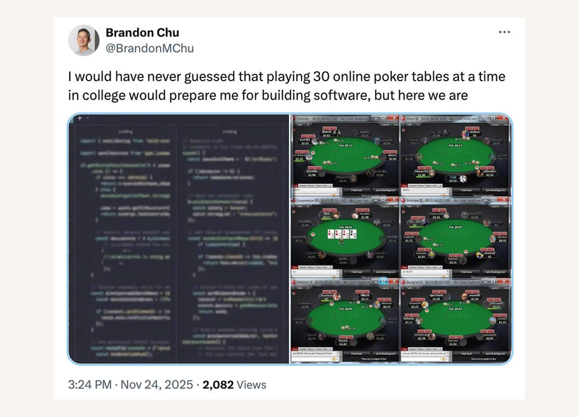 The other thing that AI is doing is it’s changing how people sort themselves as they enter the tech industry. It used to be that you’d show up at local events, and there would be a proficiency test that was, could you figure out who was good, and how to attach yourself to those people, and that’s how you’d get a job at a good startup and get on your way. Now, that doesn’t exist as much anymore. It’s been replaced by this very different filter function, which is “show us your projects”. (There is obviously a precedent with OS projects and Github; now they’re just more vertically complete.) AI is now serving the role of the “local legend” who drew the good people away from the fake work, because they can just go start cool one-person companies without asking for anybody’s permission, and have a great time doing it.