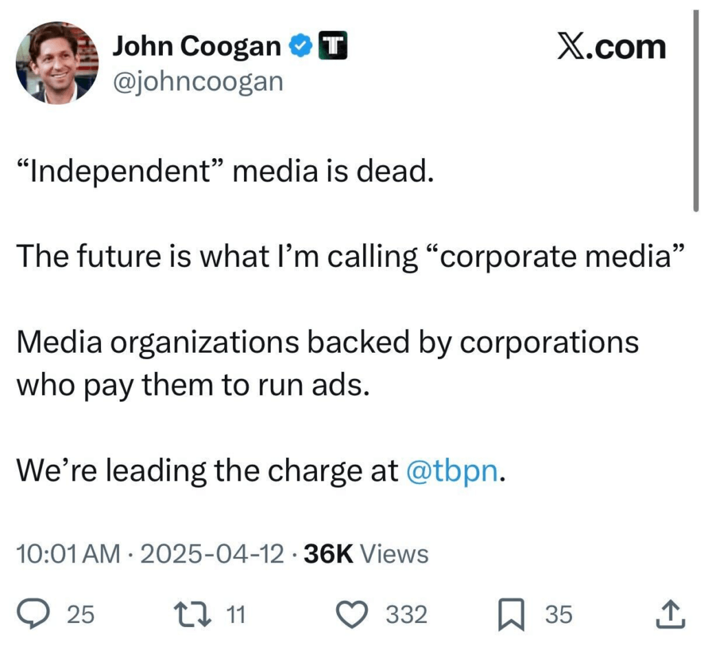 The semi-obvious and very funny logical conclusion of the New Media story arc is for it to fully collapse back into corporate media again. In our world, TBPN is the vanguard experiment for what happens when you vacuum up all of the nerds, nerd jokes, and reasonably serious nerd content that was organically getting clipped onto the timeline already, and bundle it into an ESPN-style “corporate clip show” that brings those people back into a more conventional 3 to 5 minute TV-style spot.